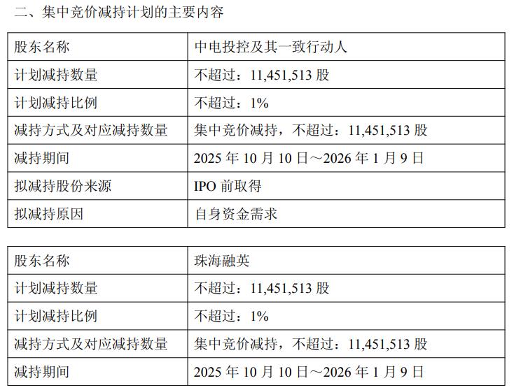 澜起科技9月10日公告,股东中电投控及其一致行动人、珠海融英拟合计减持不超过2%的公司股份。减持计划拟自2025年10月10日起的3个月内进行,减持价格将根据市场价格确定。 (文章来源:界面新闻) ...