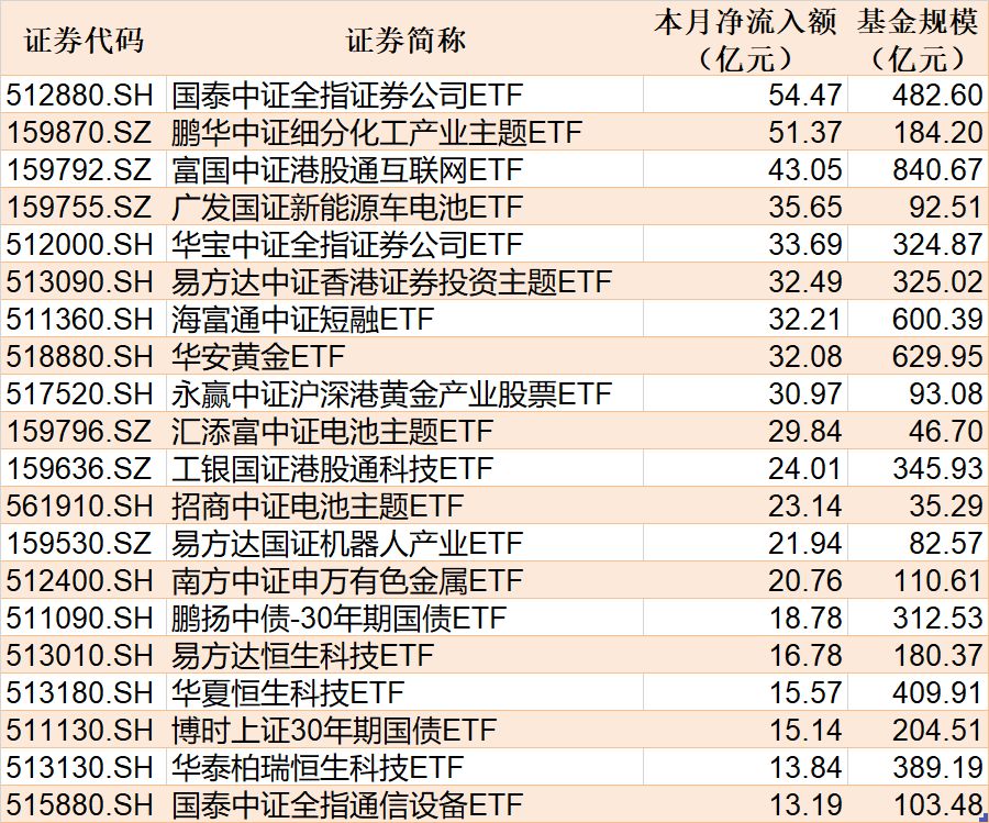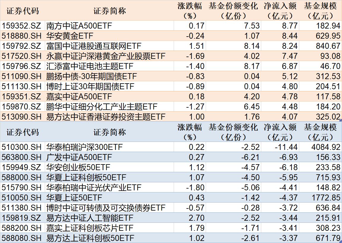 每经记者|叶峰 每经编辑|彭水萍 昨日A股三大指数震荡走强,创业板指涨超1%。从板块来看,算力硬件板块再度活跃,油气板块全天走强,影视院线板块走高。下跌方面,光伏、电池板块走势疲软。 Wind数据显示,在9月10日非货币ETF市场中,南方中证A500ETF份额增加7.53亿份,净流入额8.77亿元;华安黄金ETF份额增加1.07亿份,净流入额8.44亿元;富国中证港股通互联网ETF份额增加8.14亿份,净流入额8.24亿元。 与此同时,华泰柏瑞沪深300ETF份额减少2.52亿份,净流出额11.44亿元;广发中证A500ETF份额减少6.21亿份,净流出额6.93亿元;华安创业板50ETF份额减少4.57亿份,净流出额6.18亿元。 截至9月10日,9月资金净流入额居前20的ETF名单如下: 总体看来,Wind数据显示,9月10日全市场ETF份额为29044.88亿份,总规模为51304.40亿元。份额增加最大的行业为金融,有24只基金跟踪。份额增加最大的主题为中证电池,有4只基金跟踪。份额增加最大的指数标的为港股通互联网,有4只基金跟踪;收益最高的指数标的为通信设备(+4.49%),有1只基金跟踪。 封面图片来源:每日经济新闻 |