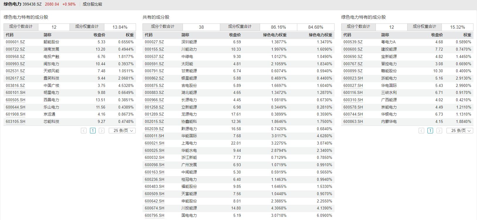 每经记者|黄小聪 每经编辑|肖芮冬 此前,我们已经对比了多个同名ETF以及背后跟踪的指数,这一期再来对比两个同名ETF:绿电ETF和能源ETF。 1、绿电ETF 目前有2只ETF名称都是绿电ETF,其中绿电ETF(159669.SZ)管理公司是国泰基金,跟踪的指数是国证绿色电力指数。 国证绿色电力指数反映的是沪深北交易所绿色电力相关上市公司的整体表现,要求公司业务领域属于清洁能源发电,包括但不限于水力发电、光伏发电、风力发电、核能发电等。 目前指数的成分股共有50只,个股的平均市值约为533亿元。 另一只绿电ETF(562550.SH)管理公司是华夏基金,跟踪的指数是中证绿色电力指数。 中证绿色电力指数是选取业务涉及光伏发电、风电、水电等绿色电力领域的50只上市公司证券作为指数样本。目前指数的成分股也是50只,平均市值约为530亿元。 进一步对比两个指数的成分股可以发现,两个指数共同的成分股是38只,各自独有的成分股是12只。 再看两个指数的过往表现,在近一年,国证绿色电力指数的表现更好,但在近五年,中证绿色电力指数的年化收益明显更高。另外,在年化波动率方面,两个指数差别并不大。