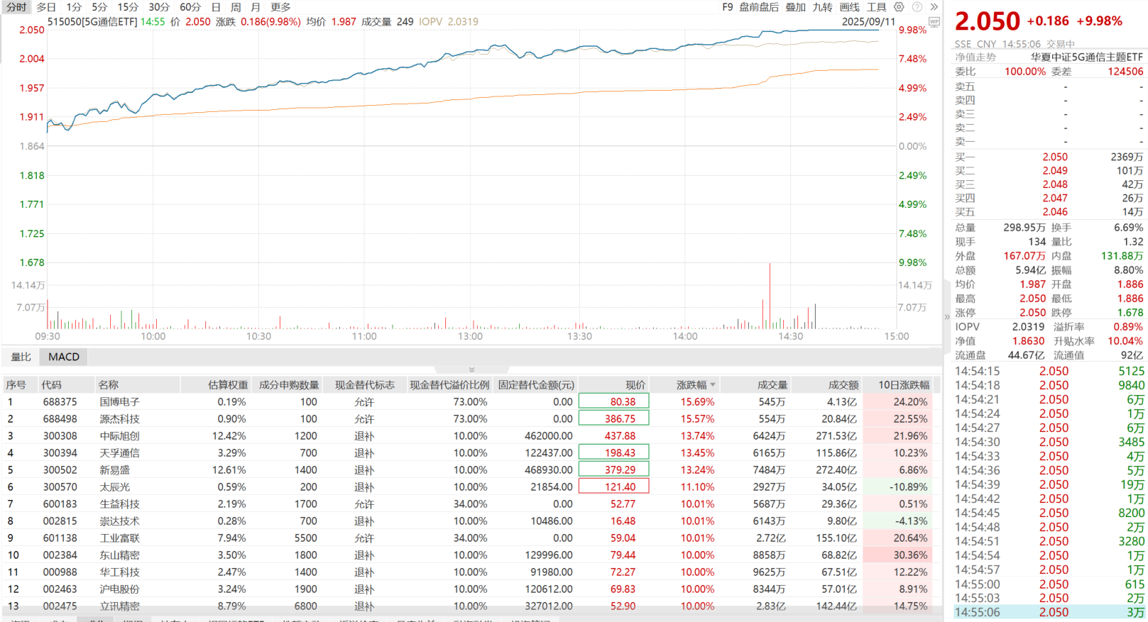 9月11日,AI算力板块一路走高,相关ETF表现强势,截至14:50,5G通信ETF(515050)强势涨停,持仓股掀起涨停潮,天孚通信、中际旭创、新易盛涨超13%,生益科技、崇达技术、工业富联、东山精密、华工科技、沪电股份等 ...