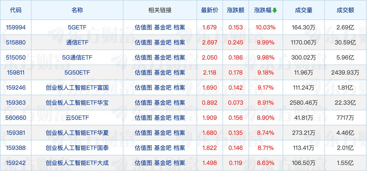 每经记者|肖芮冬 每经编辑|叶峰 天赐良基日报第727期一、今日基金新闻速览1、14只科创债ETF明日集体发售 第二批14只科创债ETF上周刚刚获批,根据日前发布的发售公告,这批产品均定档9月12日发行,且均设置了30亿元的募集规模上限,与首批科创债ETF的募集规模上限保持一致。 2、年内公募参与定增浮盈超八成 截至9月10日,今年以来公募基金参与的定增项目整体表现不俗,超过八成实现了不同程度的浮盈。对比定增价格与当前股价来看,部分定增项目的浮盈已达到500万元以上,个别甚至突破1000万元。 二、知名基金经理最新动态1、陈启明离任一只产品的基金经理 9月11日,华富基金发布公告,陈启明因工作安排,于9月9日离任华富天鑫灵活配置混合基金的基金经理,该基金由此前共同管理基金的王羿伟继续管理。 天天基金网数据显示,陈启明自2019年1月开始管理该基金,管理时间超过6年,基金A类份额任职回报达到145.00%,C类份额任职回报达到132.49%。 2、刘元海:AI未来成长空间和投资机会不可小觑 谈及当前AI产业发展情况,东吴基金知名基金经理刘元海近日接受采访时表示,预计AI应用有望逐步落地,未来成长空间和投资机会不可小觑。展望未来AI投资主线,站在当前时间点,刘元海更关注AI应用的投资机会,“相对看好以下AI应用可能存在的投资机会,包括汽车智能驾驶、AI硬件、AI人形机器人、积极拥抱AI的互联网企业等。” 三、今日ETF行情点评1、ETF行情复盘 市场全天持续走强,截至收盘,沪指涨1.65%,深成指涨3.36%,创业板指涨5.15%。沪深两市成交额2.44万亿元,较上一个交易日放量4596亿元。板块方面,电子元件、半导体、通信设备等板块涨幅居前,仅贵金属、旅游酒店、食品饮料等少数板块回调。 具体来看,5GETF、通信ETF强势涨停,多只创业板人工智能ETF涨超8%。 下跌方面,港股创新药相关ETF集体回调,最高下跌2.32%。