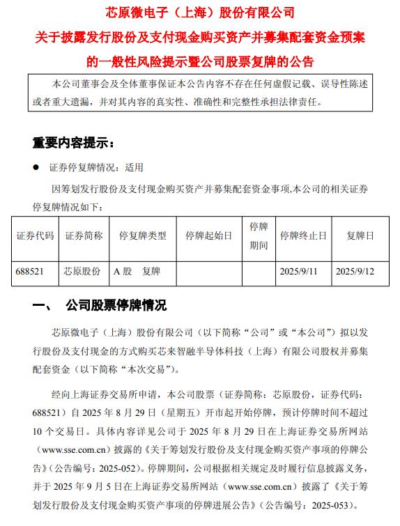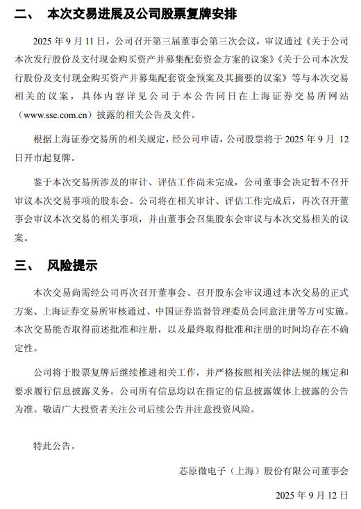 9月11日下午,芯原股份公告,公司拟以发行股份及支付现金的方式购买芯来智融半导体科技(上海)有限公司股权并募集配套资金。2025年9月11日,公司召开第三届董事会第三次会议,审议通过《关于公司本次发行股份及支付现金购买资产并募集配套资金方案的议案》《关于公司本次发行股份及支付现金购买资产并募集配套资金预案及其摘要的议案》等与本次交易相关的议案。公司股票将于2025年9月12日开市起复牌。 ![]() ![]() (文章来源:界面新闻) |