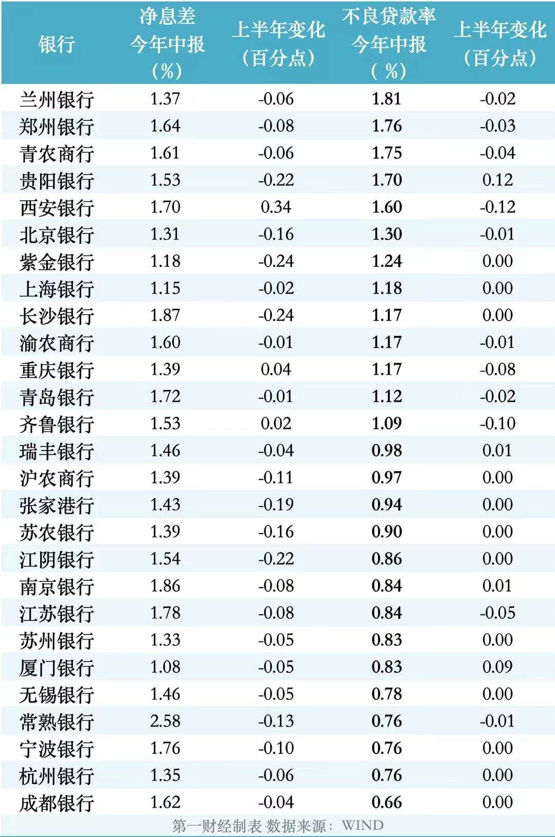 随着半年报披露,多数中小银行上半年的经营情况浮出水面。从财报信息来看,中小银行间的分化趋势和“厮杀”格局还在持续,也出现了一些新变化。 上市银行方面,城农商行整体保持了资产规模的较快扩张,在上市银行中的“份量”也进一步提升,5000亿“俱乐部”又增3家。其中,城商行“一哥”正式由北京银行“让位”给了江苏银行,农商行“老大”和“老二”的差距则进一步拉大。重点指标方面,上市城农商行的净息差首尾差了150BP,个别银行的房地产不良率飙升至逾21%。 非上市银行的经营指标变化同样值得关注,尤其是息差过低、不良率过高等极端现象。不过,在机构人士看来,随着各地、各机构采取多种措施补充资本实力、省联社改革持续推进等,中小银行风险有望在较短时间内得到改善。 城商行“一哥”换人,农商行“老二”追赶吃力 截至今年上半年末,42家A股上市银行资产总规模约为321万亿元,其中27家城商行、农商行资产总额约为36万亿元,较去年末增长了3万多亿元。 得益于整体较国有大行、股份行更快的资产扩张速度,城农商行在上市银行资产中的占比由去年末的不足11%提升到了11.21%左右。 从机构表现来看,上半年,城商行、农商行阵营发生了多个重要变化。 首先是城商行资产规模座次生变,江苏银行超越北京银行晋升为城商行新“一哥”。截至报告期末,江苏银行资产规模达到4.79万亿元,超过北京银行的4.75万亿元,主要原因在于二者的资产扩张节奏拉开距离,江苏银行、北京银行上半年资产规模增速分别为21.16%、12.47%。江苏银行这一资产规模增速在所有上市银行中也是最高的。 实际上,从赚钱能力来看,受到区位优势、发展战略等因素影响,江苏银行近年来的盈利水平早已领先于北京银行,且呈差距拉大趋势。今年上半年,江苏银行分别实现营收448.64亿元、归母净利润202.38亿元,同期北京银行分别实现营收、归母净利润362.18亿元、150.53亿元。江苏银行上半年营收、归母净利润增速分别为7.08%、8.05%,北京银行两项指标则分别为1.02%、1.12%。 ![]() 其次是资产规模5000亿元以上的城农商行又增加了3家,分别是西安银行、兰州银行、青农商行。尽管西安银行、兰州银行两家城商行分别以约5391亿元、5097亿元的资产规模和12.23%、4.82%的资产增速超越了青农商行(5053亿元,2.06%),但赚钱能力较位于山东半岛的青农商行还有较大差距。 上半年,青农商行分别实现营收、归母净利润57.52亿元、21.34亿元,同期西安银行实现营收、归母净利润52.05亿元、14.52亿元,兰州银行实现营收、归母净利润39.21亿元、9.52亿元。 整体来看,最赚钱的城农商行主要还是来自东部沿海城市。上半年,实现百亿以上归母净利润的上市城商行有6家,比去年同期多了1家,分别是江苏银行(202.38亿元)、宁波银行、北京银行、南京银行、上海银行、杭州银行(116.62亿元)。 农商行中,渝农商行(归母净利润76.99亿元)和沪农商行(归母净利润70.13亿元)依然是同业“老大”和“老二”,二者也是上半年唯二实现50亿元以上归母净利润的上市农商行。不过,沪农商行上半年营收同比下滑了3.4%,归母净利润增速也只有0.6%,和渝农商行的差距进一步拉大。 ![]() 息差首尾差了150BP,有银行房地产不良率超21% 近年来,随着息差收窄和业务布局变化,投资收益对中小银行的业绩贡献明显提升,但利息收入仍是主要收入来源,机构间的净息差分化依然严重。 今年上半年,常熟银行继续以2.58%的净息差位居42家上市银行的榜首,不过较去年也下滑了13BP;厦门银行继续以1.08%的净息差在上市银行中垫底,较去年又下降了5BP。 根据国家金融监督管理总局披露的数据,截至二季度末,商业银行的净息差为1.42%,其中城商行为1.37%,农商行为1.58%。目前来看,净息差低于同业平均水平的城商行有5家,除厦门银行外,还有杭州银行、苏州银行、北京银行、上海银行;净息差低于同业平均水平的农商行有7家,分别是江阴银行、瑞丰银行、无锡银行、张家港行、苏农银行、沪农商行、紫金银行。 从变化幅度来看,上半年西安银行、重庆银行、齐鲁银行净息差分别逆势上行了34BP、4BP、2BP,其余24家上市城农商行净息差均有不同程度下滑。其中,10家银行净息差半年降幅超过10BP,紫金银行、长沙银行、江阴银行、贵阳银行净息差降幅均超20BP。 ![]() 资产质量仍是影响中小银行风险的重要因子。截至上半年末,不良贷款率居于前十位的上市银行中,有4家城商行、1家农商行。其中,兰州银行不良率最高,为1.81%;另有3家银行不良率超过1.7%,分别是郑州银行、青农商行、贵阳银行。西安银行不良率(1.6%)也高于行业水平(1.49%)。 相比去年末,11家城农商行不良率下降,12家持平,其余4家不良率抬升的银行分别是贵阳银行、厦门银行、瑞丰银行、南京银行。其中,贵阳银行不良率从去年末的1.58%抬升了0.12个百分点至1.7%。 个人贷款和房地产领域的对公贷款仍然是主要的风险暴露领域。以贵阳银行为例,该行解释称,不良率上升主要是因为部分企业风险暴露,该行按照风险分类审慎原则将其纳入不良。财报显示,该行对公不良率攀升主要发生在房地产领域,房地产业贷款期末不良率为1.75%,较去年末攀升了70BP。同期,该行个人贷款整体不良率也从2.86%升至3.19%,增长了33BP。 还有个别银行的不良率结构性特点异常突出。比如,青农商行的房地产行业贷款不良率从去年