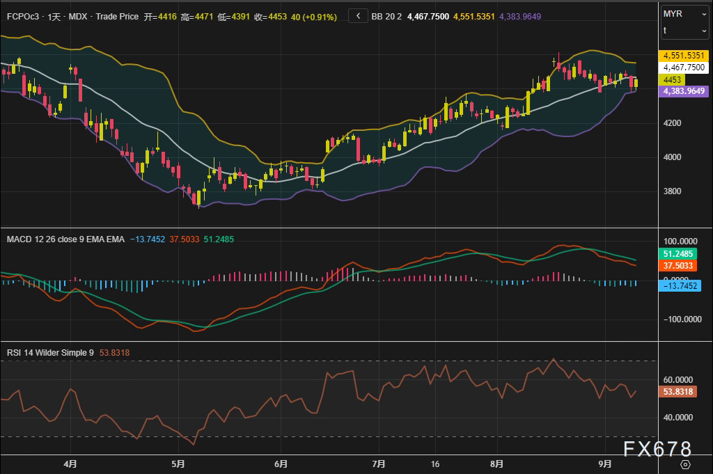 周四 9月11日 马来西亚衍生品交易所 BursaMalaysiaDerivativesExchange 棕榈油主力合约FCPOc3结束连续两日下跌 收盘报4453林吉特 吨 日内上涨40林吉特 涨幅0 91 盘中技术指标显示 RS ...