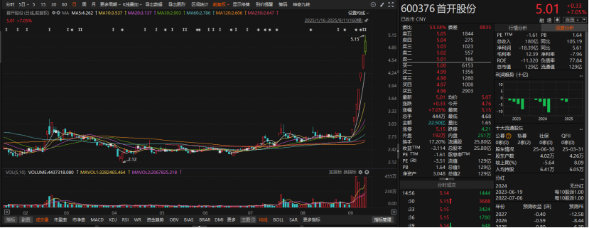 9月11日,首开股份在开盘11分钟后强势涨停,盘中走出7连板行情。截至收盘,首开股份报收于5.01元,上涨7.05%,较7连板前一个交易日即9月2日的收盘价2.64元上涨89.77%,市值达到129亿元。 一家持续亏损的房地产企业,为何走出股价翻倍行情? 主营房地产,自2022年以来持续亏损 从基本面来看,首开股份所属行业为房地产行业,主要业务包括:房地产开发、物业经营、城市更新等。今年上半年,公司实现营业收入180.39亿元,同比增长105.19%;归母净利润亏损18.39亿元。2022年至2024年,公司分别亏损4.609亿元、63.39亿元、81.41亿元。 ![]() 9月以来,首开股份累计发布5次股票交易风险提示、股票交易异常波动相关公告。 9月11日晚间,首开股份公告称,自2025年9月3日以来,公司股票累计涨幅89.77%,股票涨幅明显偏离同行业及上证指数,但是公司主营业务、生产经营情况以及经营环境与前期披露的信息相比未发生重大变化。公司不存在应披露而未披露的重大信息,不存在影响公司股票交易价格异常波动的重大事项。 就市场情况来看,公司在半年报中表示,我国房地产行业正处于转型升级的关键时期,政策利好尚未充分传导,市场回暖尚需时日。公司也面临着销售规模有待回升、开复工面积逐年下降、创新转型成效有待显现,以及持有型物业的盈利能力仍需提升等现实挑战。 控股子公司间接持股宇树科技0.3% Choice终端显示,截至9月11日收盘,首开股份股价较9月2日收盘价上涨89.77%,总市值增加超60亿元。 业内分析师在接受上证报采访时表示,此次异常波动或与公司持股机器人企业存在关联。“首开股份主要是被资金选上,作为炒作标的。” 在公司最新发布的公告中,首开股份回应称,盈信公司为公司持股比例为62.74%的控股子公司。截至2025年7月,盈信公司对金石成长股权投资(杭州)合伙企业(有限合伙)(以下简称“基金”)认缴出资3亿元,实缴出资1.8亿元。经公司了解,截至8月25日,基金的认缴规模为460963.95万元。据此计算,盈信公司持有基金的认缴份额比例约为6.51%。 公告称,根据天眼查显示,基金持有宇树科技4.7683%股权。按此计算,盈信公司间接持有的宇树科技股权比例约为0.3%,持股比例很低。盈信公司对基金的投资仅为财务性投资,对基金决策运作无控制力和影响力。 Choice终端显示,首开股份9月以来累计5次登上龙虎榜。具体来看,以游资买入为主,机构现卖出动作。其中,9月5日,一家机构卖出1.57亿元,占当日总成交的比例高达10.09%,位列卖出榜第一。 ![]() 9月至今,首开股份股吧的讨论中,宇树科技存在感显著增强,多次被不同投资者提及,成为股吧内的热议词。有投资者称持有首开股份要“拿到宇树科技上市”。 近几日,宇树科技拟IPO的消息,一度引发资本市场的高度关注。9月2日,宇树科技正式宣布,预计将在2025年10月至12月期间向证券交易所提交上市申请文件。 紧接着,市场上传出了宇树科技为其计划中的IPO寻求高达500亿元人民币公司估值的消息。不过,宇树科技迅速对相关估值消息予以否认。公司称,内外至今没有讨论过IPO估值的事情。 (文章来源:上海证券报) |