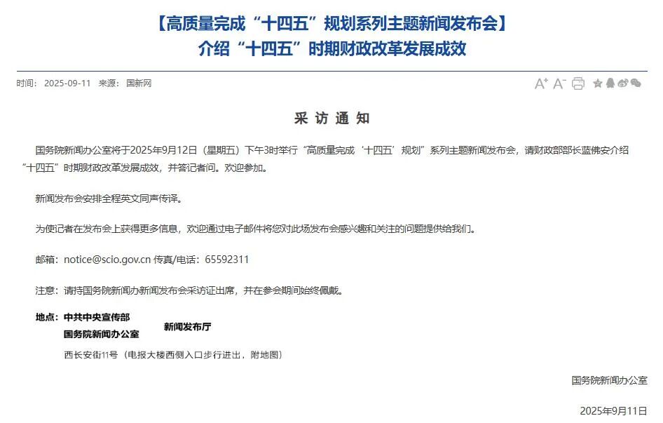 中国证券报记者9月11日从国新办获悉,国务院新闻办公室将于9月12日(星期五)下午3时举行“高质量完成‘十四五’规划”系列主题新闻发布会,请财政部部长蓝佛安介绍“十四五”时期财政改革发展成效,并答记者问 ...