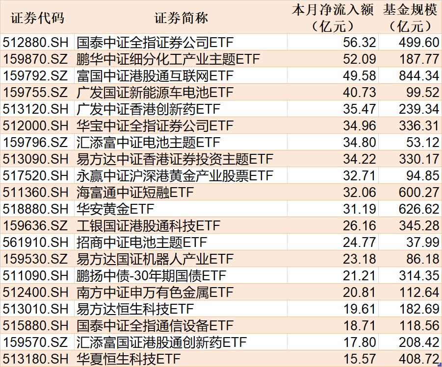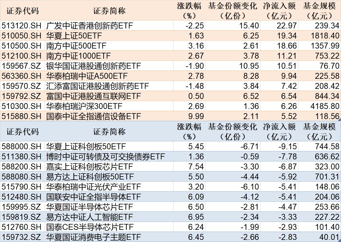 每经记者|叶峰 每经编辑|彭水萍 昨日市场全天持续走强,创业板指和深成指双双再创年内新高。从板块来看,算力硬件板块全天走强,卫星互联网概念股延续强势,芯片概念股集体爆发。下跌方面,影视院线概念股走势疲软。 Wind数据显示,在9月11日非货币ETF市场中,广发中证香港创新药ETF份额增加15.40亿份,净流入额22.97亿元;华夏上证50ETF份额增加6.25亿份,净流入额19.34亿元;南方中证500ETF份额增加2.61亿份,净流入额18.66亿元。 资金净流出方面,华夏上证科创板50ETF份额减少6.71亿份,净流出额9.15亿元;博时中证可转债及可交换债券ETF份额减少0.59亿份,净流出额7.78亿元;嘉实上证科创板芯片ETF份额减少3.30亿份,净流出额6.87亿元。 截至9月11日,9月资金净流入额居前20的ETF名单如下: 总体看来,Wind数据显示,9月11日全市场ETF份额为29170.64亿份,总规模为52389.34亿元。份额增加最大的行业为医药,有9只基金跟踪。份额增加最大的主题为中证电池,有4只基金跟踪。份额增加最大的指数标的为中证A500,有40只基金跟踪;收益最高的指数标的为通信设备主题(+9.25%),有1只基金跟踪。 封面图片来源:每日经济新闻 |
