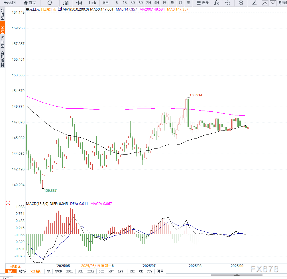 周五亚洲时段,日元兑美元走软,主要受到国内政治不确定性影响。市场担心日本首相石破茂辞职后的继任者可能继续对日本央行施压,维持低利率政策,这一预期削弱了日元的支撑力。 ![]() 另一方面,美国经济数据显示劳动力市场正在持续降温。美国8月CPI环比上涨0.4%,高于预期,但同时初请失业金人数升至2021年10月以来新高,叠加疲弱的非农就业数据,使市场几乎完全定价美联储年内三次降息。 根据CME FedWatch工具,市场预计下周FOMC会议将宣布25个基点的降息,并在10月和12月继续放松政策。这一预期拖累了美元走势,使其跌至7月24日以来的低点,从而在一定程度上限制了美元兑日元的反弹空间。 分析人士指出,日本国内政治的不确定性是短期内日元最大的压力来源,而美国降息预期则构成美元的结构性利空,两者交织下,美元兑日元走势可能维持震荡。 日线图显示,USD/JPY在147.00关口获得支撑后企稳反弹,但整体依旧承压于200日均线(约148.75)之下。K线形态表明多头尝试突破,但MACD动能尚未形成明确方向,市场处于观望状态。 若价格无法突破148.20-148.75区域,预计将再次回落考验146.20的关键支撑,进一步跌破则可能加速下探至145.00心理关口。反之,若突破并站稳149.00,则有望打开新一轮上行空间,目标或指向月内高点149.15甚至150.00。 ![]() ![]() |