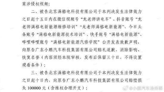 9月12日消息,小鹏汽车法务部今日发文称,工信部等六部门正在联合部署开展汽车行业网络乱象专项整治行动,小鹏汽车也在积极响应,依法捍卫合法权益。 近日,广州互联网法院就小鹏汽车与北京满格电科技有限公司的网络侵权责任纠纷案件作出判决,判令被告满格电公司删除其发布的侵权内容,公开发表致歉声明并赔偿小鹏汽车经济损失。 公告称,满格电公司曾在网络平台用多个账号如“龙老师讲电车”(曾用名“龙哥讲电车”)、“龙老师满格电新能源维修培训”等,多次发表关于小鹏汽车产品的不实言论和恶意诋毁内容。 小鹏汽车法务部称,将配合相关部门共同营造行业良好舆论环境,坚决打击蓄意造谣抹黑,发布虚假信息误导公众的违法和侵权行为。 (责任编辑:宋政 HN002)