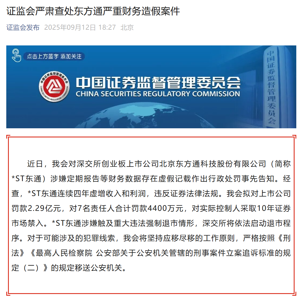 【导读】证监会严肃查处东方通严重财务造假案件,深交所将依法启动退市程序 *ST东通严重财务造假案,证监会最新通报来了! 9月12日,“证监会发布”信息显示:证监会严肃查处东方通严重财务造假案件。 ...