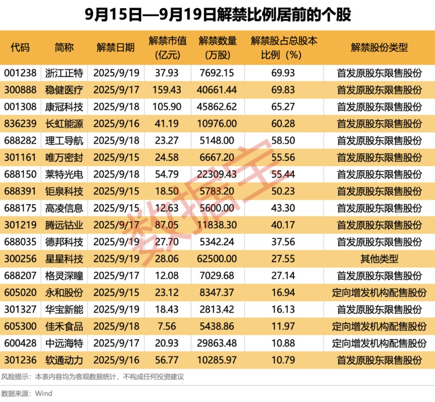 下周47家上市公司迎来限售股解禁,解禁市值合计高达785.47亿元。 下周A股解禁市值逾780亿元 据证券时报·数据宝统计,下周(9月15日至19日),A股市场将有47家上市公司迎来限售股解禁。以个股最新价计算,下周解禁股对应市值合计高达785.47亿元。 从规模上看,17股解禁市值超过10亿元。稳健医疗、康冠科技解禁市值逾100亿元,依次为159.43亿元、105.9亿元。腾远钴业随后,解禁市值87.05亿元;软通动力和莱特光电解禁市值也均超过50亿元。从类型上看,上述五股均为首发原股东限售股份。 ![]() 稳健医疗本次解禁40661.44万股,股东为稳健集团有限公司。该公司上半年实现营收52.96亿元,同比增长31.31%,主要系内生与外延的主营业务双重增长,医疗板块整体实现收入25.2亿元,同比增长46.4%;消费品业务同比增长20.3%。实现归母净利润4.92亿元,同比增长28.07%。 9月17日,稳健医疗将迎来上市五周年纪念日。过去五年,公司坚持不打价格战,致力于为消费者提供高品质、最具性价比的产品,始终秉持产品领先战略,打造差异化优势。公司专注于构建内部确定性,坚持医疗与消费两大赛道并驾齐驱。未来,公司将继续以稳健经营回报市场,迎接下一个更高质量的成长阶段。 康冠科技本次解禁45862.62万股,共涉及4名股东。公司上半年实现营收约69.35亿元,同比增长5.06%;归母净利润3.84亿元,同比下降6.03%;经营活动产生的现金流量净额8亿元,同比增长180.43%,整体毛利率较去年同期增长0.32%。 公司表示,营收显著增长,主要源于公司自有品牌海外市场的拓展成效凸显,海外增量贡献突出。毛利率的提升,一方面,得益于公司通过AI等新技术赋能产品创新,有效提升产品附加值,电竞显示器、移动智慧屏、智能美妆镜等产品深受消费者喜爱;另一方面,也源于海外业务本身较高的毛利水平。 18股解禁比例逾10% 相较于市值规模,解禁比例(解禁股数量占总股本比例)更能反映出解禁对于个股股价的冲击。 在上述47股中,共计18股解禁比例高于10%。浙江正特、稳健医疗、康冠科技、长虹能源解禁比例居前,均高于60%;理工导航、唯万密封、莱特光电、钜泉科技随后,解禁比例高于50%。上述8股均为首发原股东限售股份。 ![]() 浙江正特本次解禁7692.15万股,占比69.93%,共涉及4名股东。公司上半年实现营收10.42亿元,同比增长38.63%;归母净利润7050.88万元,同比增长56.03%。 华西证券指出,公司业绩增长主要受益于公司战略大单品星空篷进入了Costco多家线下门店。短期来看,老产品基本筑底,大客户正在恢复补货,2025年有望迎来订单复苏,同时公司爆款产品星空篷仍处于增长红利期,有望维持较快增长。长期来看,公司成长驱动在于星空篷替代木制产品、渗透率进一步提升,电商渠道拓展,以及客户采购份额提升。 在解禁类型为定向增发机构配售股份的个股中,粗略计算,参与投资国机精工、三友医疗、永和股份、中远海特和佳禾食品的机构本次解禁收益率为正。其中,国机精工收益率高于120%;三友医疗收益率高于50%;永和股份收益率高于40%。 在下周47只解禁股中,有22股解禁类型为股权激励一般股份或限售股份,占比近半数。 从解禁规模看,宁德时代、唯捷创芯、华大九天、申能股份解禁市值逾1亿元,依次为5.22亿元、2.95亿元、2.94亿元、1.17亿元。从解禁比例看,唯捷创芯和星昊医药均高于1%。 (文章来源:证券时报网) |