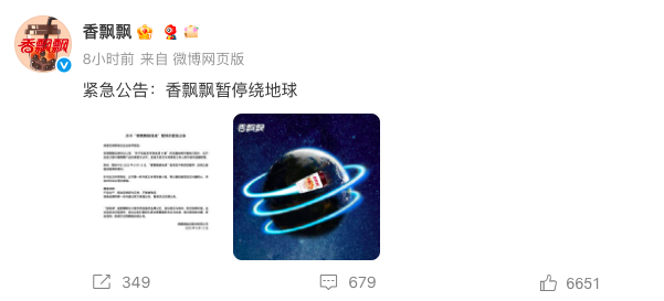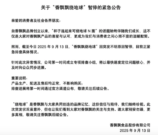 9月13日,香飘飘官方微博发布紧急公告:“香飘飘暂停绕地球。” 香飘飘称,自香飘飘品牌创立以来,“杯子连起来可绕地球 N圈”的话题始终伴随我们成长,这不仅是大家对香飘飘产品的喜爱与认可,更成为我们与 ...