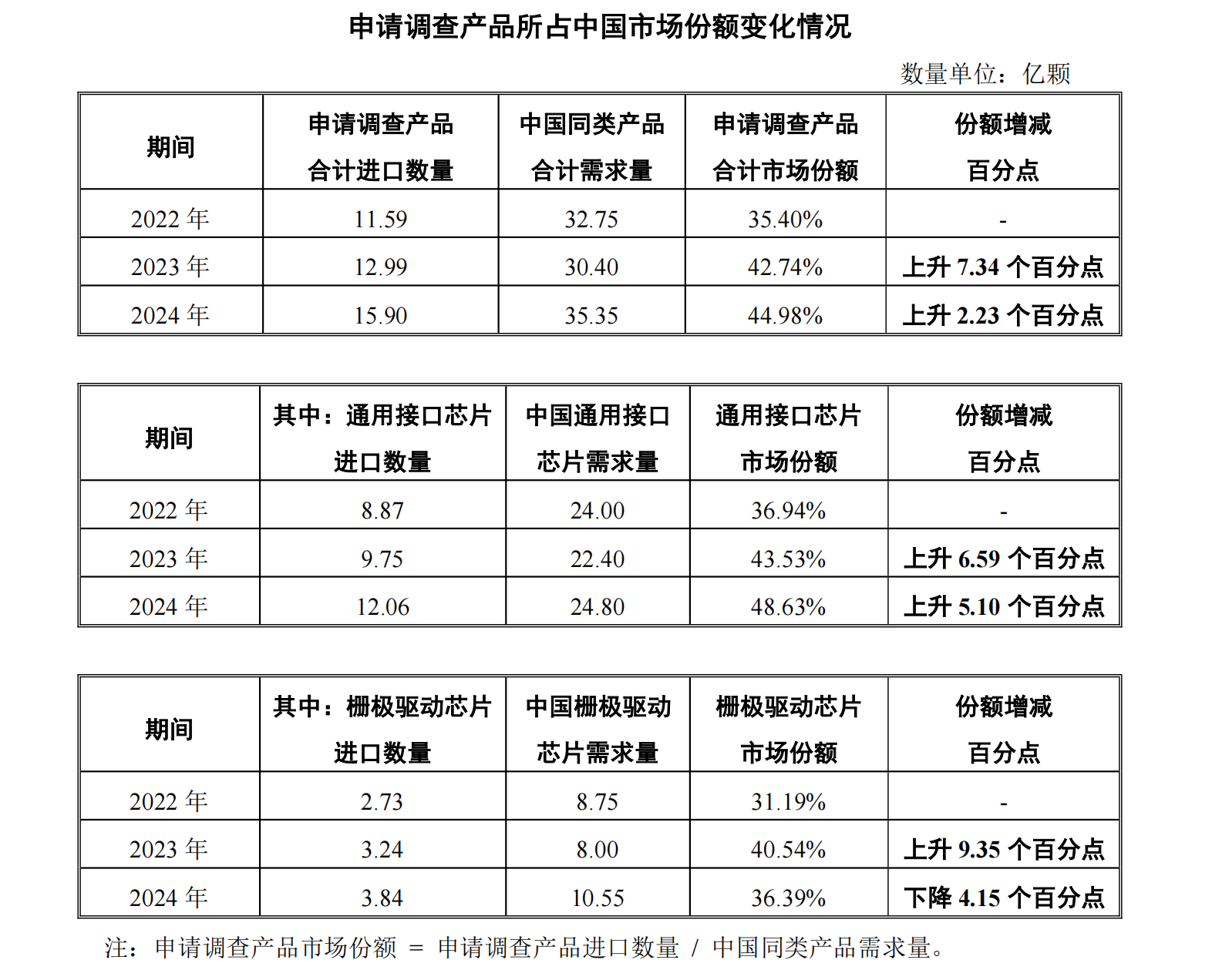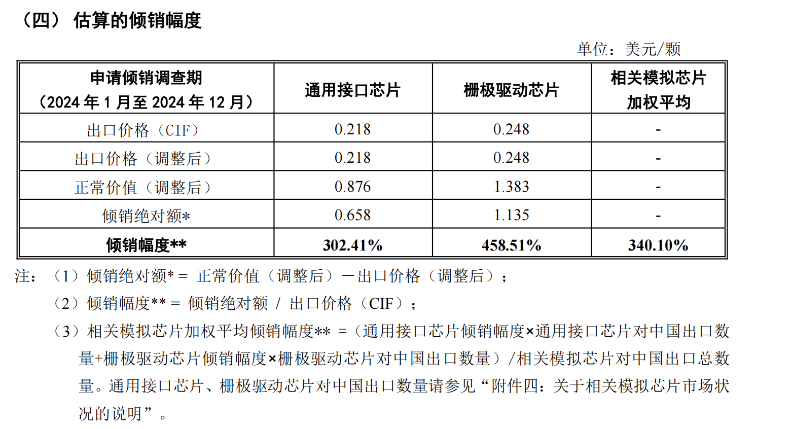 9月13日,中国商务部发布公告,决定对原产于美国的进口相关模拟芯片发起反倾销调查。 商务部新闻发言人表示,此次反倾销调查是应中国国内产业申请发起,符合中国法律法规和世贸组织规则。调查涉及自美进口的通用接口和栅极驱动芯片。根据申请人提交的初步证据显示,2022至2024年,申请调查产品自美进口量累计增长37%,进口价格累计下降52%,压低和抑制了国内产品销售价格,对国内产业的生产经营造成损害。 据江苏省半导体行业协会提交的申请文件,相关美国生产商包括四家,分别是德州仪器、ADI、博通、安森美。根据该协会提交的初步证据显示,申请调查期内,原产于美国的申请调查产品的价格持续大幅下降,对华出口的倾销幅度高达300%以上,申请调查产品占中国市场份额年均高达41%。 “降价”吃下中国半壁市场 原产于美国的倾销进口相关模拟芯片,正在对中国相关模拟芯片产业造成严重冲击。 根据江苏省半导体行业协会测算,在2024年1月1日至2024年12月31日的倾销调查期内,美国进口相关模拟芯片的倾销幅度呈现“超高额”特征。其中,通用接口芯片倾销幅度达302.41%,栅极驱动芯片倾销幅度更高至458.51%,远超正常贸易范畴,构成典型的恶意倾销行为。 ![]() 在2022到2024年期间,美国相关模拟芯片对华进口量呈现 “持续大幅增长” 态势,从绝对数量来看,申请调查产品占中国同类产品总进口量的比例呈逐年上升趋势,三年进口量分别为11.59亿颗、12.99亿颗、15.90亿颗,2023年较2022年增长12.07%,2024年较2023年增长22.36%,2024年较2022年累计增幅高达37.13%,进口规模不断扩大。 从市场占比来看,美国相关模拟芯片2022年占中国同类产品总进口量的比例为47.81%,2023年升至53.06%,2024年进一步增至62.14%,三年年均占比达54.34%,成为中国相关模拟芯片进口的 “主力军”。 ![]() 在国内市场份额方面,美国相关产品占比从2022年的35.40%升至2024年的44.98%。分产品类型来看,通用接口芯片2022-2024年进口量分别为8.87亿颗、9.75亿颗、12.06亿颗,2024年较2022年累计增长36.04%;栅极驱动芯片同期进口量分别为2.73亿颗、3.24亿颗、3.84亿颗,2024年较2022年累计增长40.67%。 在逐步掌控国内市场定价权后,上述芯片却在通过降价的方式挤压国产产品生存空间。 比如,美国相关通用接口芯片从2022年3.00元/颗降至2023年2.04元/颗,2024年则为1.55元/颗,2024年较2022年累计降幅48.33%。而栅极驱动芯片也从2022年3.99元/颗降至2023年2.53元/颗,2024年为1.76元/颗,2024年较2022年累计降幅55.85%。 ![]() 以美国德州仪器(TI)为例,TI的通用接口芯片(CAN接口)TCAN1043DRQ1型号,2022年1季度为2.1元/颗,2024年4季度1.13元/颗,累计降幅超46%。隔离型栅极驱动芯片UCC21520QDWRQ1以及非隔离型栅极驱动芯片UCC27524AD的产品价格降幅也分别在上述时间点累计降幅达到50%以及53%。 ![]() 相较之下,通用接口芯片国内价格2024年较2022年累计降33.59%,栅极驱动芯片累计降22.13%,且国内价格降幅始终低于进口产品,国内企业陷入“被动跟跌”的市场困境。2024年相比2023年,国内产业同类产品的加权平均单位内销毛利润下降33.41%,其中通用接口芯片的单位内销毛利润下降38.76%,栅极驱动芯片的单位内销毛利润下降22.68%,获利能力大幅下降。 江苏省半导体行业协会表示:“原产于美国的倾销进口相关模拟芯片,已对中国相关模拟芯片产业造成严重冲击,国内企业从2023年起由盈转亏,2024年亏损额进一步扩大7.05%,开工率较2022年下降17个百分点,研发投入能力被严重削弱。” 协会强调,国内同类产品在物化特性、技术指标、生产工艺、应用场景等方面与美国进口产品高度相似,具备替代能力,但美国企业凭借产能优势与低价倾销策略,挤压国产产品市场空间。此次申请调查,是依据《江苏省半导体行业协会章程》,代表国内产业维护合法权益,推动产业回归公平竞争轨道。 两大协会发声呼吁公平竞争 商务部新闻发言人表示,调查机关收到申请后,依法对申请书进行了审查,认为申请符合反倾销调查立案条件,决定发起调查。 对此,中国机电产品进出口商会(简称“中国机电商会”)与中国半导体行业协会均明确表达支持立场。 9月13日晚间,中国机电商会发布声明指出,一段时期以来,美国政府泛化国家安全概念,滥用出口管制和 “长臂管辖”,在集成电路领域对华实施一系列禁止与限制措施。这种单边主义行为不仅损害了中国企业和产业的正当权益,还严重扰乱了全球产业链与供应链,商会对此坚决反对。 同时,商会强调,依据中国法律及世贸组织规则,针对进口产品低价冲击国内市场的情况,国内产业有权申请反倾销调查;对于其他国家或地区在贸易中对中国采取歧视性禁止、限制措施,中国政府也可依法采取相应举措。基于此,中国机电商会表示将积极支持和配合调查机关的调查工作,坚定维护公平贸易秩序与产业合法权益。 此外,商会还提到,半导体产业的稳健发展离不开公平竞争的市场环境,鼓励企业通过持续推动技术创新、加强产业链协同以及开展国际合作等方式,共同推动半导体产业迈向高质量发展新阶段,携手构建开放公平、有序的市场环境,为全球半导体产业繁荣奠定基础。 同样在13日晚间,中国半导体行业协会也对商务部的调查公告表示支持。协会认为,半导体产业的健康发展需要公平的环境,赞成并鼓励企业依靠持续的技术创新、产业链上下游协同以及平等互利的国际合作,遵