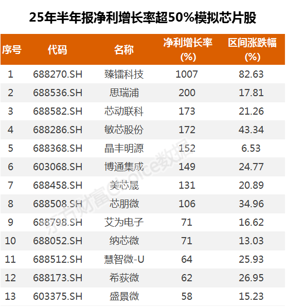 模拟芯片领域有重磅消息! 据财联社,据商务部官网公告,依据《中华人民共和国反倾销条例》第十六条的规定,商务部决定自2025年9月13日起对原产于美国的进口相关模拟芯片进行反倾销立案调查。本次调查确定的倾销调查期为2024年1月1日至2024年12月31日,产业损害调查期为2022年1月1日至2024年12月31日。 被调查产品描述和主要用途为:相关模拟芯片中使用40nm及以上工艺制程的通用接口芯片(Commodity Interface IC Chip)和栅极驱动芯片(Gate Driver IC Chip)。 9月13日晚,中国半导体行业协会发布声明:我们注意到,商务部9月13日发布公告,对自美国进口的相关模拟芯片发起反倾销调查,就美国对华集成电路领域相关措施发起反歧视调查,我们对此表示支持。 半导体产业的健康发展,需要一个公平的环境。我们赞成并鼓励企业通过持续的技术创新、产业链上下游协同、平等互利的国际合作,按照市场规则良性竞争,共同推动半导体产业进步。 中国半导体行业协会将积极支持和配合调查机关的调查,坚定维护公平贸易和产业合法权益。 01 中国是全球模拟芯片最大消费市场 公开资料显示,模拟芯片是一种用于处理连续信号的集成电路。与数字芯片主要处理离散的二进制数据不同,模拟芯片能够处理如声音、光线、温度、压力等物理量所转换的连续电信号。 模拟芯片包括放大器、滤波器、电源管理芯片、数据转换器(如ADC和DAC)等多种类型,广泛应用于各类电子设备中,是电子系统的关键组成部分。 我国是全球模拟芯片最大消费市场。据WSTS(世界半导体贸易统计)数据显示,中国模拟芯片市场在2024年达到3175.8亿元人民币(约合450亿美元),占全球市场的58.5%,成为全球最大的单一市场,这一比例远超中国在全球半导体市场34%的平均占比水平。WSTS预计,2025/2026年模拟芯片全球市场分别增长3.3%/5.1%至822/864亿美元。 另据弗若斯特沙利文,2024年我国占全球模拟芯片市场的35%左右,是海外模拟芯片大厂收入的主要来源地之一,TI德州仪器/ADI亚德诺/MPS芯源系统2024财年来自中国的收入分别约30/21/12亿美元,合计63亿美元,潜在国产化空间较大。 02 机构:汽车、AI或成国产化重点 模拟芯片设计门槛高,学习曲线时间跨度长,海外公司此前一直占据着模拟芯片市场主导地位。IC Insights数据显示,2023年全球模拟厂商排名中,占比前十的企业均为海外公司,CR10达68%。 而模拟芯片主要是以成熟制程的产品为主,机构观点认为,国内供应链相对成熟。华创证券指出,2024年我国模拟芯片自给率约16%,消费电子等领域国产化率领先,而工业、汽车等中高端市场中尚有广阔替代空间。 从下游应用领域来看,国信证券认为,工业、汽车、AI是国际大厂布局的重点领域,也是国产化的重点: 其中,工业领域中,下游去完库存后将恢复正常采购和新产品导入,国内企业近几年大额研发推出的新产品有望规模放量;且模拟芯片工业领域毛利率一般优于消费电子,新品放量有望提高企业盈利能力。 AI领域除了带动模拟芯片整体需求外,AI产业链的国产化也是重点,以多相电源为代表的核心电源管理芯片既是增量市场,也是国产化的重点和难点。 汽车领域中,汽车模拟芯片仍是增量市场,且国产化处于起步阶段,前几年相关企业仍是以产品研发和导入为主,目前正进入集中放量阶段。 消费电子方面,模拟芯片公司早期多以聚焦个别产品系列为主,随着产品开发能力的提高以及客户关系的加深,围绕手机等应用终端丰富产品系列,为客户提供一站式解决方案成为必然选择,马太效应将愈加明显。 03 模拟芯片哪些票净利高增长 东方财富Choice数据显示,在模拟芯片板块(申万3级)个股中,2025年半年报净利润增长率超50%的个股总计有13个,其中臻镭科技、思瑞浦、芯动联科、敏芯股份、晶丰明源、博通集成、美芯晟、芯朋微的净利润增长率超过了100%。 ![]() 从今年4月7日低点以来的涨幅角度看,涨幅最大的就是臻镭科技,4月7日至今累计涨幅已经超80%。 ![]() 从机构研报看,臻镭科技的模拟芯片业务还涉及卫星互联网概念。浙商证券研报表示,公司在卫星互联网领域,公司所涉及的电源管理产品种类包含负载点电源芯片(POL、LDO 和电源模块)、电池均衡器芯片和固态电子开关芯片。其中,电池均衡器芯片需为每个蓄电池单独进行保护,固态电子开关需管理航天器内部近百路的配电和热控线路,负载点电源芯片需为每个星上载荷提供多种电源变换,每个类别的芯片在单个航天器内部均有数百颗的用量,芯片用量和附加值较高。 04 机构看好这些票 从近期机构研报看,机构看好多只半年报高增长但涨幅相对较小的上市公司。 平安证券表示,思瑞浦的主营业务为模拟与数模混合集成电路产品的研发与销售,致力于发展成为平台型模拟芯片设计公司。凭借领先的研发实力、可靠的产品质量和优质的客户服务,公司的模拟芯片产品已进入众多知名客户的供应链体系,应用范围涵盖工业控制、信息通信、新能源和汽车、医疗健康、消费电子等众多领域,已形成工业、汽车、通信及消费电子协同发展的多元化市场布局。 天风证券表示,芯动联科为国内MEMS惯性传感器龙头,依托全链条自主技术及高毛利优势,持续受益于低空经济、智能驾驶及人形机器人等新兴场景需求增长。通过车规级IMU研发突破与国产替代加速,公司产品结构持续优化,客户黏性增强。 光大证券表示,晶丰明