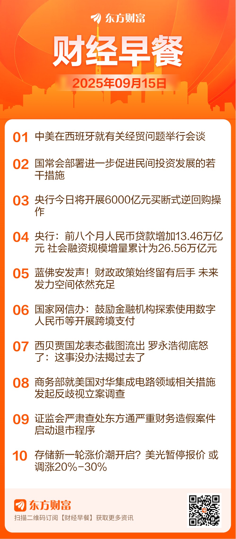 ![]() 每日精选民间投资: 国务院总理李强主持召开国务院常务会议,部署进一步促进民间投资发展的若干措施。会议指出,要聚焦企业关切的突出问题,在扩大准入、打通堵点、强化保障等方面实施一批务实举措,进一步促进民间投资发展。要拓宽民间投资空间,支持民间资本加大新质生产力、新兴服务业、新型基础设施等领域投资。 财政政策: 财政部部长蓝佛安9月12日在国新办举行的“高质量完成‘十四五’规划”系列主题新闻发布会上表示,财政政策统筹考虑防风险和促发展,始终留有后手,未来财政政策发力空间依然充足。 政府债务: 财政部部长蓝佛安介绍,截至2024年末,我国政府全口径债务总额为92.6万亿元,包括国债34.6万亿元、地方政府法定债务47.5万亿元、地方政府隐性债务10.5万亿元,政府负债率为68.7%。同时,我国政府债务对应着大量优质资产。总体看,我国政府负债率处于合理区间,风险安全可控。 中美会谈: 美方消息称,美国财长贝森特近日将在西班牙马德里与国务院副总理何立峰举行会谈,对此,商务部新闻发言人表示,中共中央政治局委员、国务院副总理何立峰于9月14日至17日率团赴西班牙与美方举行会谈。双方将讨论美单边关税措施、滥用出口管制及TikTok等经贸问题。 美对中实体制裁: 美商务部宣布将多家中国实体列入出口管制“实体清单”。对此,商务部新闻发言人表示,美国商务部泛化国家安全、滥用出口管制,对半导体、生物科技、航空航天、商贸物流等领域多家中国实体实施制裁。中方敦促美方立即纠正错误做法,停止对中国企业的无理打压。中方将采取必要措施,坚决维护中国企业的合法权益。 金融数据: 中国人民银行公布8月金融数据。数据显示,2025年8月末,广义货币(M2)余额331.98万亿元,同比增长8.8%。2025年8月末,社会融资规模存量为433.66万亿元,同比增长8.8%。前八个月净投放资金5208亿元。 央行逆回购: 为保持银行体系流动性充裕,2025年9月15日,中国人民银行将以固定数量、利率招标、多重价位中标方式开展6000亿元买断式逆回购操作,期限为6个月(182天)。 科创咨询委员会: 上交所第三届科技创新咨询委员会委员候选人名单公示。该届科创咨询委委员候选人共有60人,其中,王兴兴、彭志辉和韩璧丞等多家知名科技公司的创始人入选。根据《上海证券交易所科技创新咨询委员会工作规则》,上交所启动了科技创新咨询委员会换届工作。经相关单位推荐、履行相关程序,形成第三届咨询委委员候选人名单。 热点题材生物医药: 国务院总理李强主持召开国务院常务会议,审议通过《生物医学新技术临床研究和临床转化应用管理条例(草案)》。会议指出,要推动我国生物医学技术创新发展,加快技术研发和成果转化应用,促进生物医药产业提质升级,着力塑造发展新优势。要坚持发展和安全并重,依法规范临床研究,保障临床应用质量安全,有效防范各类风险,确保创新成果更好增进人民健康福祉。 集成电路: 商务部发布公告,依据《中华人民共和国对外贸易法》第七条、第三十六条规定,任何国家或地区在贸易方面对中华人民共和国采取歧视性的禁止、限制或者其他类似措施的,中华人民共和国可以根据实际情况对该国家或者该地区采取相应的措施。商务部可自行或会同国务院其他有关部门发起相关调查。 模拟芯片: 商务部于2025年7月23日收到江苏省半导体行业协会(申请人)代表国内相关模拟芯片产业正式提交的反倾销调查申请,申请人请求对原产于美国的进口相关模拟芯片进行反倾销调查。根据审查结果,依据《中华人民共和国反倾销条例》第十六条的规定,商务部决定自2025年9月13日起对原产于美国的进口相关模拟芯片进行反倾销立案调查。 存储芯片: 随着AI从训练向推理与边缘设备延伸,大容量存储器需求持续升温,供应趋紧。消息称,美光高层观察到,客户需求预测显示重大供应短缺,因此公司决定紧急暂停所有产品报价,重新调整后续价格。 数字人民币: 国家网信办会同有关部门起草了《促进和规范电子单证应用规定(征求意见稿)》,向社会公开征求意见。其中鼓励货物贸易、物流、金融等领域机构和企业在开展业务时认可、使用电子单证,提升业务应用数字化水平,促进行业提质增效。鼓励金融机构在依法合规、风险可控前提下,根据电子单证特点,探索使用数字人民币等新型支付方式开展跨境支付,积极稳妥开展金融产品和服务模式创新。 核电: 工信部等三部门印发《电力装备行业稳增长工作方案(2025—2026年)》,其中提到,稳步推进核电开发,积极安全有序地推动一批沿海核电项目核准建设。优化全国电力系统设计,核准建设一批重点电力互济工程。推进智能微电网建设和电源电网侧储能应用,提高电网对清洁能源接纳、配置和调控能力。 储能: 国家发展改革委、国家能源局印发《新型储能规模化建设专项行动方案(2025—2027年)》的通知(下称《行动方案》)。《行动方案》提出,2025-2027年三年内全国储能新增装机容量超过1亿千瓦;到2027年,全国新型储能装机规模达到1.8亿千瓦(180 GW)以上,带动项目直接投资约2500亿元,新型储能技术路线仍以锂离子电池储能为主,各类技术路线及应用场景进一步丰富,培育一批试点应用项目,打造一批典型应用场景。 数据要素: 市场监管总局等部门联合印发《关于加快推进质量认证数字化