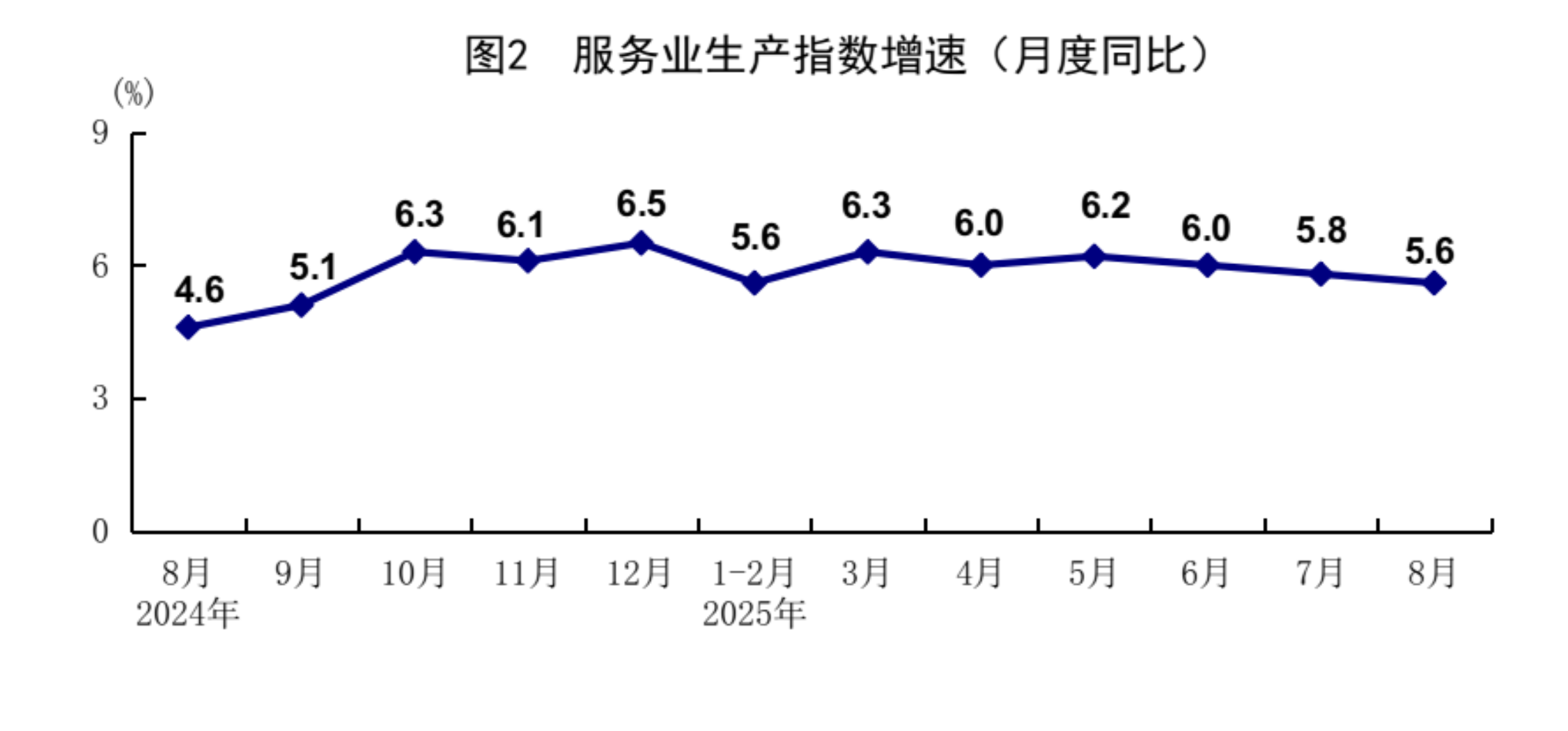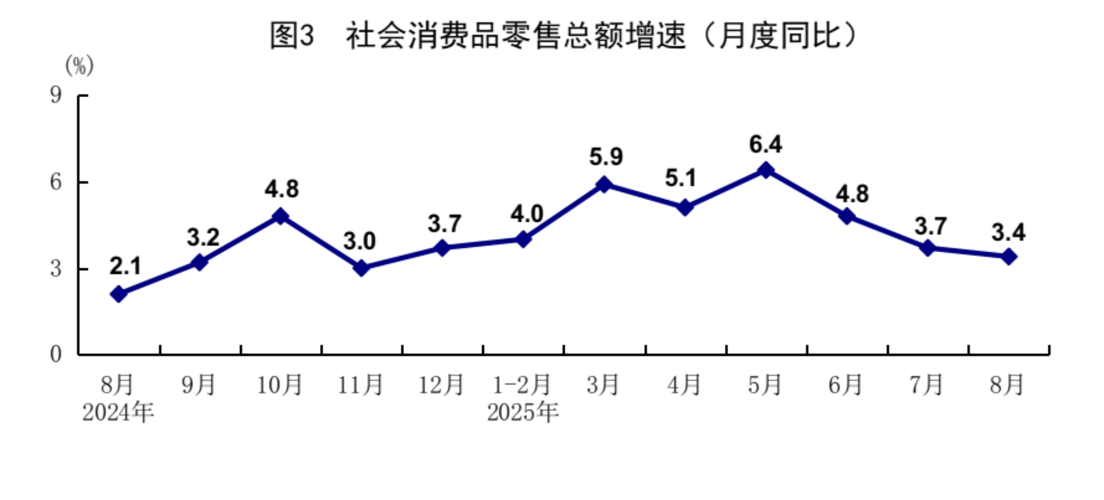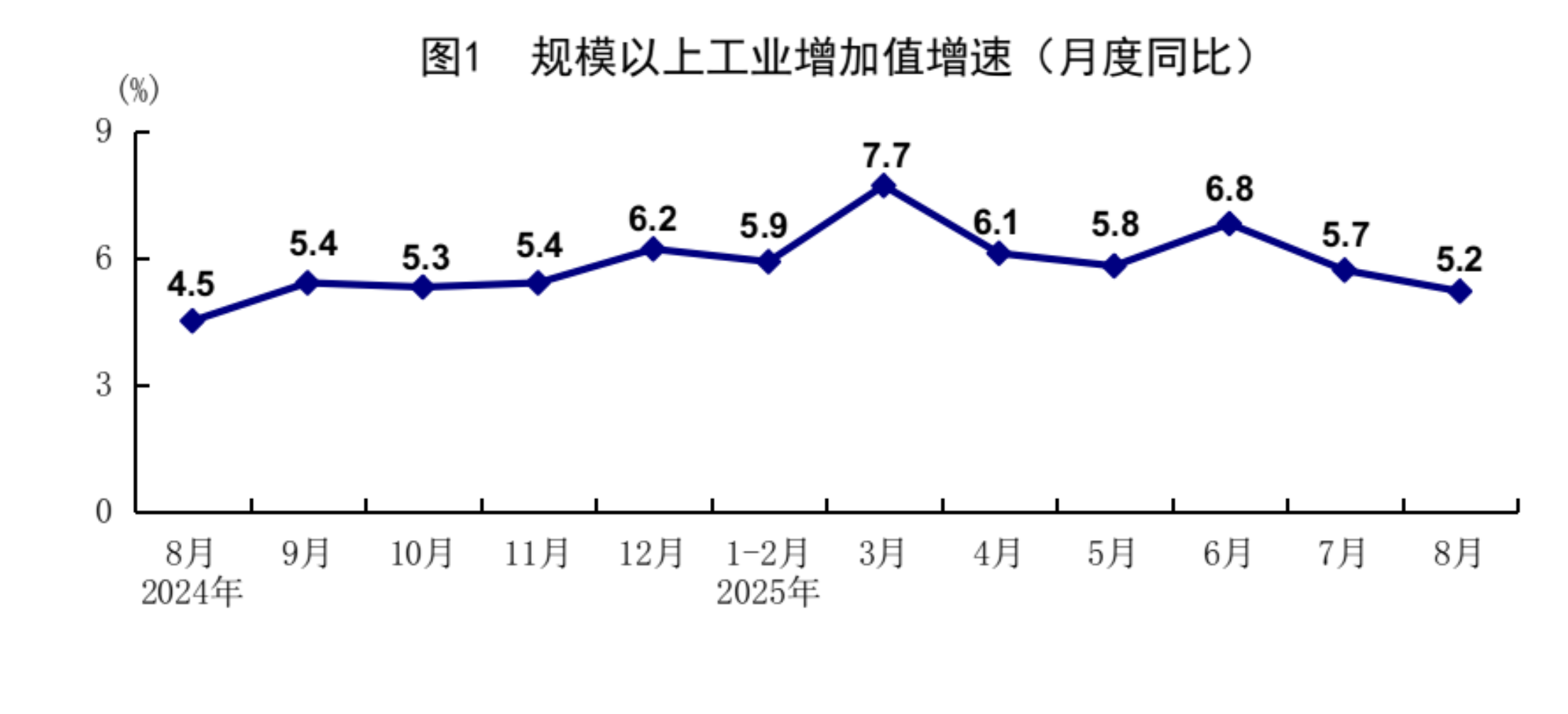 8月份,在以习近平同志为核心的党中央坚强领导下,各地区各部门认真贯彻落实党中央、国务院决策部署,坚持稳中求进工作总基调,完整准确全面贯彻新发展理念,加快构建新发展格局,积极强化宏观政策调节,纵深推进全国统一大市场建设,着力做强国内大循环,生产需求基本平稳,就业物价总体稳定,新动能培育壮大,国民经济保持总体平稳、稳中有进发展态势。 一、工业生产较快增长,装备制造业和高技术制造业增势较好 8月份,全国规模以上工业增加值同比增长5.2%,环比增长0.37%。分三大门类看,采矿业增加值同比增长5.1%,制造业增长5.7%,电力、热力、燃气及水生产和供应业增长2.4%。装备制造业增加值同比增长8.1%,高技术制造业增加值增长9.3%,分别快于全部规模以上工业增加值2.9和4.1个百分点。分经济类型看,国有控股企业增加值同比增长4.7%;股份制企业增长6.0%,外商及港澳台投资企业增长2.3%;私营企业增长4.6%。分产品看,3D打印设备、新能源汽车、工业机器人等产品产量同比分别增长40.4%、22.7%、14.4%。1-8月份,全国规模以上工业增加值同比增长6.2%。8月份,制造业采购经理指数为49.4%,比上月上升0.1个百分点;企业生产经营活动预期指数为53.7%,上升1.1个百分点。1-7月份,全国规模以上工业企业实现利润总额40204亿元,同比下降1.7%。 ![]() 二、服务业较快增长,现代服务业发展向好 8月份,全国服务业生产指数同比增长5.6%。分行业看,信息传输、软件和信息技术服务业,金融业,租赁和商务服务业生产指数同比分别增长12.1%、9.2%、7.4%,分别快于服务业生产指数6.5、3.6、1.8个百分点。1-8月份,全国服务业生产指数同比增长5.9%。1-7月份,规模以上服务业企业营业收入同比增长7.4%。8月份,服务业商务活动指数为50.5%,比上月上升0.5个百分点;服务业业务活动预期指数为57.0%,上升0.4个百分点。其中,铁路运输、水上运输、航空运输、电信广播电视及卫星传输服务、资本市场服务等行业商务活动指数位于60.0%以上高位景气区间。 ![]() 三、市场销售平稳增长,服务零售增长较快 8月份,社会消费品零售总额39668亿元,同比增长3.4%;环比增长0.17%。按经营单位所在地分,城镇消费品零售额34387亿元,同比增长3.2%;乡村消费品零售额5281亿元,增长4.6%。按消费类型分,商品零售额35172亿元,增长3.6%;餐饮收入4496亿元,增长2.1%。基本生活类和部分升级类商品销售增势良好,限额以上单位日用品类、粮油食品类、体育娱乐用品类商品零售额分别增长7.7%、5.8%、16.9%。消费品以旧换新政策效果继续显现,限额以上单位家具类、家用电器和音像器材类、文化办公用品类、通讯器材类商品零售额分别增长18.6%、14.3%、14.2%、7.3%。1-8月份,社会消费品零售总额323906亿元,同比增长4.6%。全国网上零售额99828亿元,同比增长9.6%。其中,实物商品网上零售额80964亿元,增长6.4%,占社会消费品零售总额的比重为25.0%。1-8月份,服务零售额同比增长5.1%。其中,文体休闲服务类、旅游咨询租赁服务类、交通出行服务类零售额较快增长。 ![]() 四、固定资产投资保持增长,制造业投资增长较快 1-8月份,全国固定资产投资(不含农户)326111亿元,同比增长0.5%;扣除房地产开发投资,全国固定资产投资增长4.2%。分领域看,基础设施投资同比增长2.0%,制造业投资增长5.1%,房地产开发投资下降12.9%。全国新建商品房销售面积57304万平方米,同比下降4.7%;新建商品房销售额55015亿元,下降7.3%。分产业看,第一产业投资同比增长5.5%,第二产业投资增长7.6%,第三产业投资下降3.4%。民间投资同比下降2.3%;扣除房地产开发投资,民间投资增长3.0%。高技术产业中,信息服务业,航空、航天器及设备制造业,计算机及办公设备制造业投资同比分别增长34.1%、28.0%、12.6%。8月份,固定资产投资(不含农户)环比下降0.20%。 ![]() 五、货物进出口持续增长,贸易结构继续优化 8月份,货物进出口总额38744亿元,同比增长3.5%。其中,出口23035亿元,增长4.8%;进口15709亿元,增长1.7%。1-8月份,货物进出口总额295696亿元,同比增长3.5%。其中,出口176056亿元,增长6.9%;进口119640亿元,下降1.2%。1-8月份,一般贸易进出口增长2.2%,占进出口总额的比重为63.9%。对共建“一带一路”国家进出口增长5.4%。民营企业进出口增长7.4%,占进出口总额的比重为57.1%,比上年同期提高2.1个百分点。机电产品出口增长9.2%,占出口总额的比重为60.2%。 六、就业形势总体稳定,城镇调查失业率季节性上升 1-8月份,全国城镇调查失业率平均值为5.2%。8月份,全国城镇调查失业率为5.3%,比上月上升0.1个百分点,与上年同月持平。本地户籍劳动力调查失业率为5.4%;外来户籍劳动力调查失业率为5.0%,其中外来农业户籍劳动力调查失业率为4.7%。31个大城市城镇调查失业率为5.3%,比上月上升0.1个百分点,比上年同月下降0.1个百分点。全国企业就业人员周平均工作时间为48.5小时。 七、核心CPI继续回升,工业生产者价格降幅收窄 8月份,全国居民消费价格(CPI)同比下降0.4%,环比持平。分类别看,食品烟酒价格同比下降2.5%,衣着价格上涨1.8%,居住价格上涨0.1%,生活用品及服务价格上涨1.8%,交通通信价格下降2.4%,教育文化娱乐价格上涨1.0%,医疗保健价格上涨0.9%,其他用品及服务价格上涨8.6%。在食品烟酒价格中,猪肉价格下降16.1%,鲜菜价格下降15.2%,鲜果价格下降3.7%,粮食价格下降0.8%。扣除食品和能源价格后的核心CPI同比上涨0.9%,涨幅比上月扩大0.1个