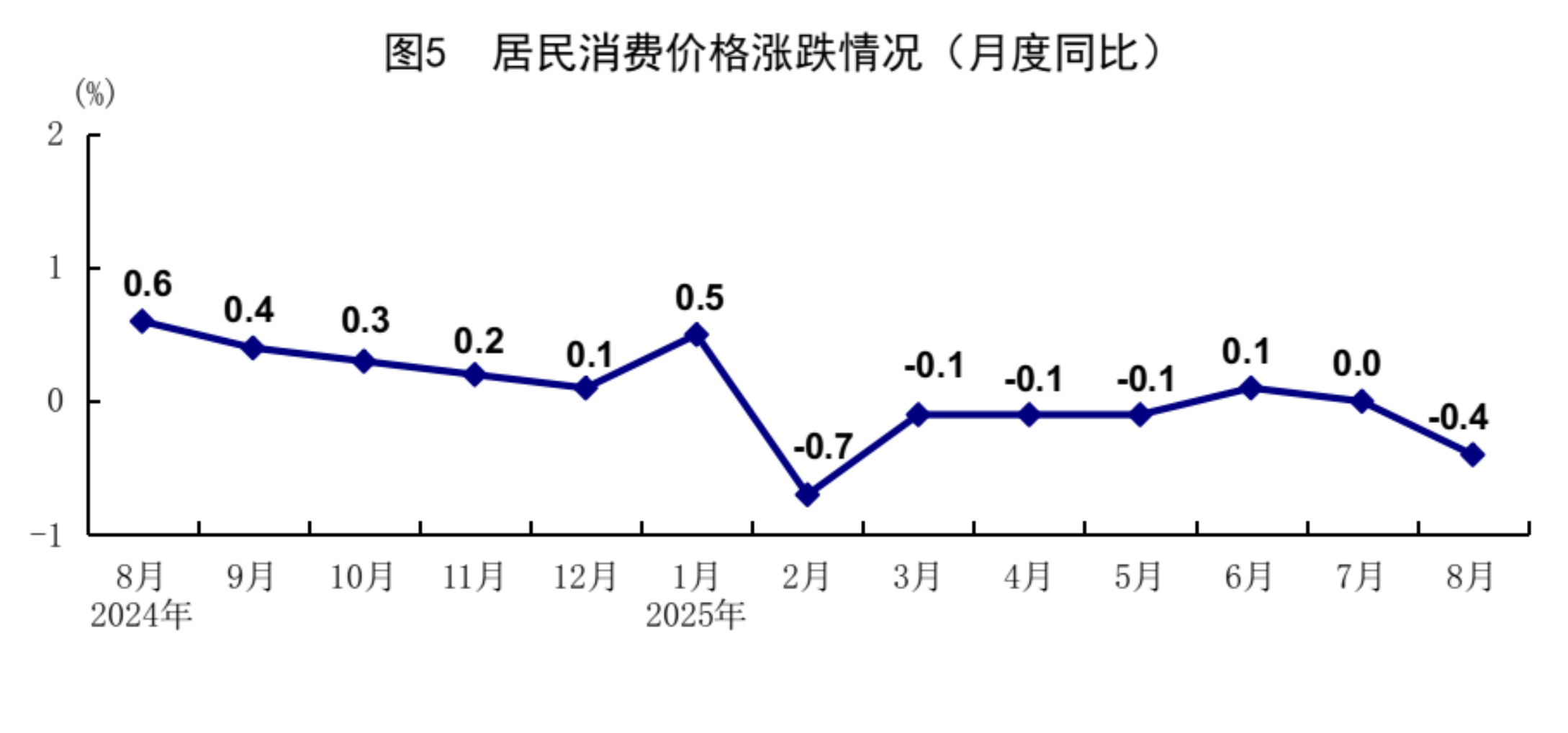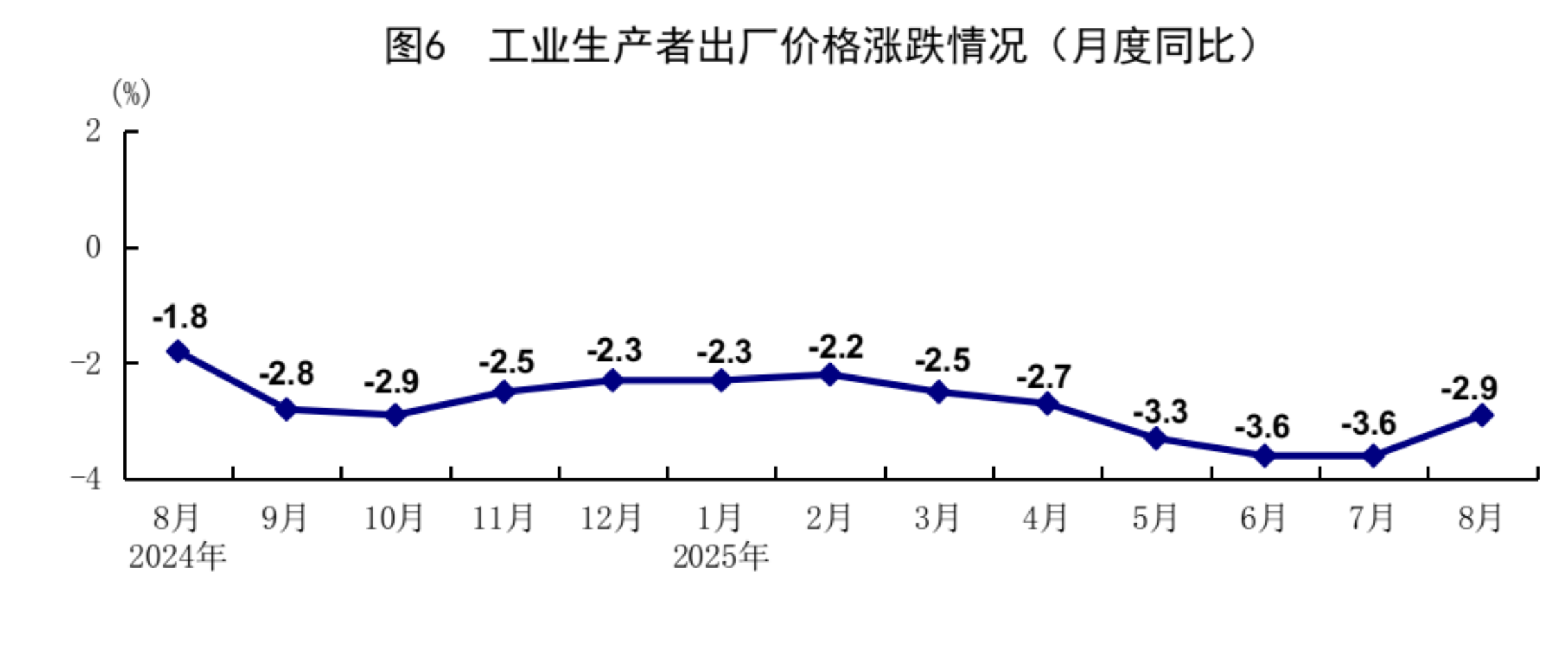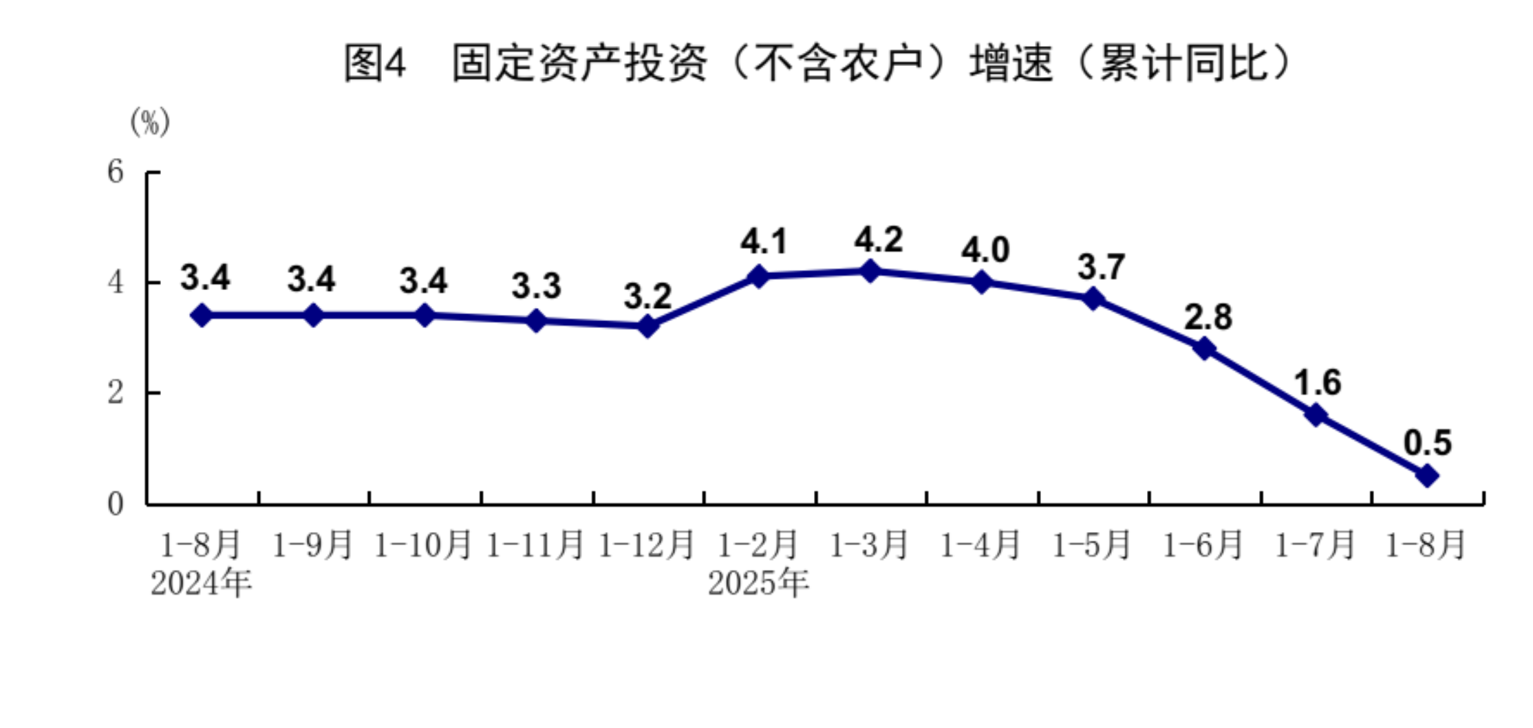 8月份,在以习近平同志为核心的党中央坚强领导下,各地区各部门认真贯彻落实党中央、国务院决策部署,坚持稳中求进工作总基调,完整准确全面贯彻新发展理念,加快构建新发展格局,积极强化宏观政策调节,纵深推进全国统一大市场建设,着力做强国内大循环,生产需求基本平稳,就业物价总体稳定,新动能培育壮大,国民经济保持总体平稳、稳中有进发展态势。 一、工业生产较快增长,装备制造业和高技术制造业增势较好 8月份,全国规模以上工业增加值同比增长5.2%,环比增长0.37%。分三大门类看,采矿业增加值同比增长5.1%,制造业增长5.7%,电力、热力、燃气及水生产和供应业增长2.4%。装备制造业增加值同比增长8.1%,高技术制造业增加值增长9.3%,分别快于全部规模以上工业增加值2.9和4.1个百分点。分经济类型看,国有控股企业增加值同比增长4.7%;股份制企业增长6.0%,外商及港澳台投资企业增长2.3%;私营企业增长4.6%。分产品看,3D打印设备、新能源汽车、工业机器人等产品产量同比分别增长40.4%、22.7%、14.4%。1-8月份,全国规模以上工业增加值同比增长6.2%。8月份,制造业采购经理指数为49.4%,比上月上升0.1个百分点;企业生产经营活动预期指数为53.7%,上升1.1个百分点。1-7月份,全国规模以上工业企业实现利润总额40204亿元,同比下降1.7%。 ![]() 二、服务业较快增长,现代服务业发展向好 8月份,全国服务业生产指数同比增长5.6%。分行业看,信息传输、软件和信息技术服务业,金融业,租赁和商务服务业生产指数同比分别增长12.1%、9.2%、7.4%,分别快于服务业生产指数6.5、3.6、1.8个百分点。1-8月份,全国服务业生产指数同比增长5.9%。1-7月份,规模以上服务业企业营业收入同比增长7.4%。8月份,服务业商务活动指数为50.5%,比上月上升0.5个百分点;服务业业务活动预期指数为57.0%,上升0.4个百分点。其中,铁路运输、水上运输、航空运输、电信广播电视及卫星传输服务、资本市场服务等行业商务活动指数位于60.0%以上高位景气区间。 ![]() 三、市场销售平稳增长,服务零售增长较快 8月份,社会消费品零售总额39668亿元,同比增长3.4%;环比增长0.17%。按经营单位所在地分,城镇消费品零售额34387亿元,同比增长3.2%;乡村消费品零售额5281亿元,增长4.6%。按消费类型分,商品零售额35172亿元,增长3.6%;餐饮收入4496亿元,增长2.1%。基本生活类和部分升级类商品销售增势良好,限额以上单位日用品类、粮油食品类、体育娱乐用品类商品零售额分别增长7.7%、5.8%、16.9%。消费品以旧换新政策效果继续显现,限额以上单位家具类、家用电器和音像器材类、文化办公用品类、通讯器材类商品零售额分别增长18.6%、14.3%、14.2%、7.3%。1-8月份,社会消费品零售总额323906亿元,同比增长4.6%。全国网上零售额99828亿元,同比增长9.6%。其中,实物商品网上零售额80964亿元,增长6.4%,占社会消费品零售总额的比重为25.0%。1-8月份,服务零售额同比增长5.1%。其中,文体休闲服务类、旅游咨询租赁服务类、交通出行服务类零售额较快增长。 ![]() 四、固定资产投资保持增长,制造业投资增长较快 1-8月份,全国固定资产投资(不含农户)326111亿元,同比增长0.5%;扣除房地产开发投资,全国固定资产投资增长4.2%。分领域看,基础设施投资同比增长2.0%,制造业投资增长5.1%,房地产开发投资下降12.9%。全国新建商品房销售面积57304万平方米,同比下降4.7%;新建商品房销售额55015亿元,下降7.3%。分产业看,第一产业投资同比增长5.5%,第二产业投资增长7.6%,第三产业投资下降3.4%。民间投资同比下降2.3%;扣除房地产开发投资,民间投资增长3.0%。高技术产业中,信息服务业,航空、航天器及设备制造业,计算机及办公设备制造业投资同比分别增长34.1%、28.0%、12.6%。8月份,固定资产投资(不含农户)环比下降0.20%。 ![]() 五、货物进出口持续增长,贸易结构继续优化 8月份,货物进出口总额38744亿元,同比增长3.5%。其中,出口23035亿元,增长4.8%;进口15709亿元,增长1.7%。1-8月份,货物进出口总额295696亿元,同比增长3.5%。其中,出口176056亿元,增长6.9%;进口119640亿元,下降1.2%。1-8月份,一般贸易进出口增长2.2%,占进出口总额的比重为63.9%。对共建“一带一路”国家进出口增长5.4%。民营企业进出口增长7.4%,占进出口总额的比重为57.1%,比上年同期提高2.1个百分点。机电产品出口增长9.2%,占出口总额的比重为60.2%。 六、就业形势总体稳定,城镇调查失业率季节性上升 1-8月份,全国城镇调查失业率平均值为5.2%。8月份,全国城镇调查失业率为5.3%,比上月上升0.1个百分点,与上年同月持平。本地户籍劳动力调查失业率为5.4%;外来户籍劳动力调查失业率为5.0%,其中外来农业户籍劳动力调查失业率为4.7%。31个大城市城镇调查失业率为5.3%,比上月上升0.1个百分点,比上年同月下降0.1个百分点。全国企业就业人员周平均工作时间为48.5小时。 七、核心CPI继续回升,工业生产者价格降幅收窄 8月份,全国居民消费价格(CPI)同比下降0.4%,环比持平。分类别看,食品烟酒价格同比下降2.5%,衣着价格上涨1.8%,居住价格上涨0.1%,生活用品及服务价格上涨1.8%,交通通信价格下降2.4%,教育文化娱乐价格上涨1.0%,医疗保健价格上涨0.9%,其他用品及服务价格上涨8.6%。在食品烟酒价格中,猪肉价格下降16.1%,鲜菜价格下降15.2%,鲜果价格下降3.7%,粮食价格下降0.8%。扣除食品和能源价格后的核心CPI同比上涨0.9%,涨幅比上月扩大0.1个