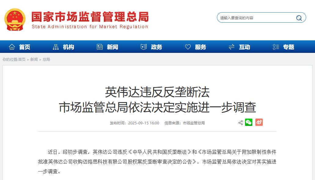 近日,经初步调查,英伟达公司违反《中华人民共和国反垄断法》和《市场监管总局关于附加限制性条件批准英伟达公司收购迈络思科技有限公司股权案反垄断审查决定的公告》,市场监管总局依法决定对其实施进一步调查。 ![]() (文章来源:市场监管总局) |