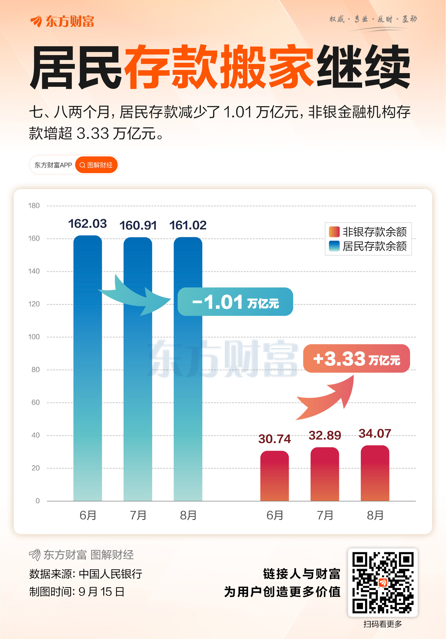 居民存款和非银存款连续两个月出现“跷跷板”现象,“存款搬家入市”成为投资者热议的话题。 央行上周末发布的金融数据显示,8月,居民存款新增1100亿元,同比少增6000亿元;非银存款新增1.18万亿元,较2024 ...
