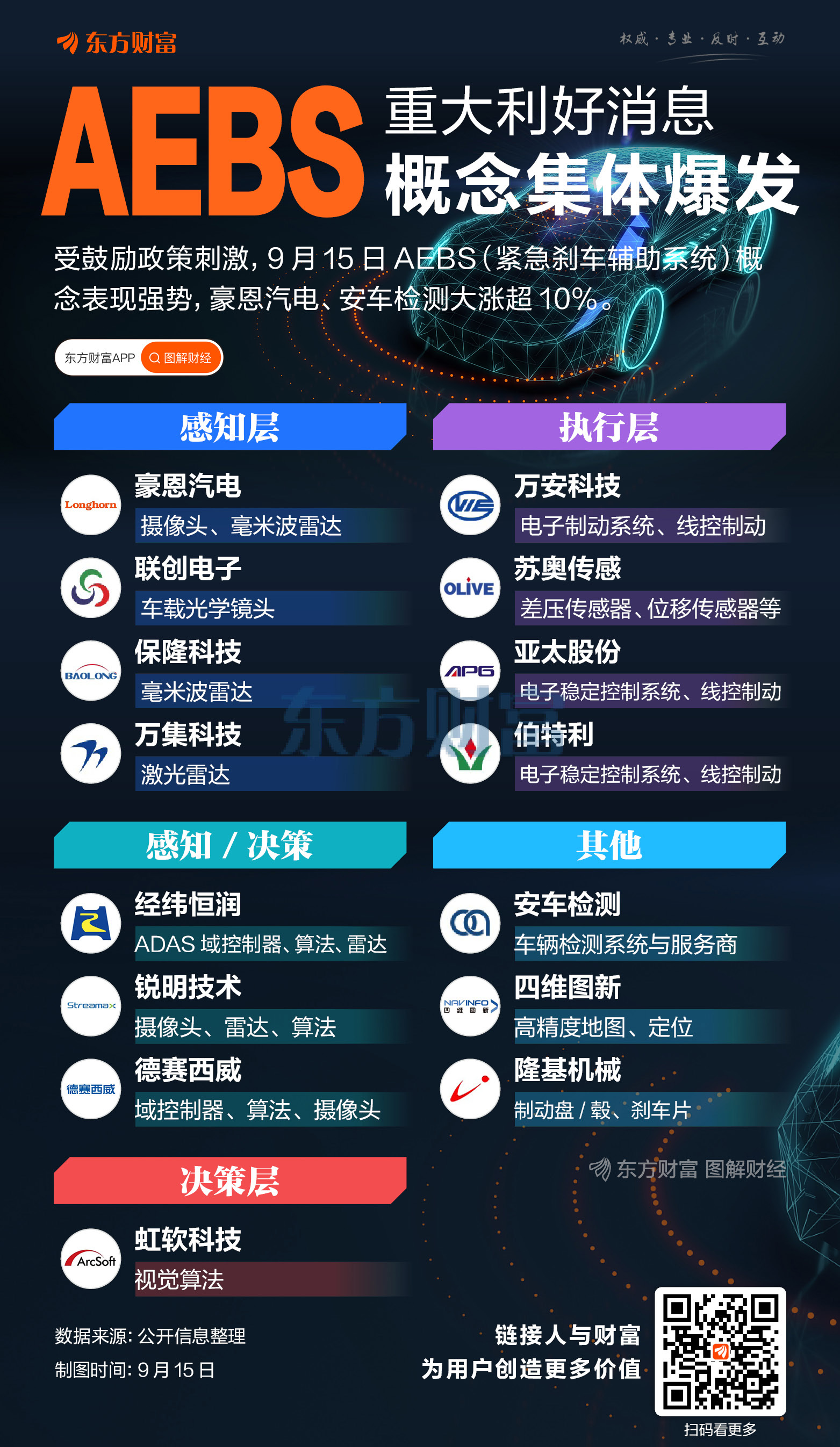 AEBS(紧急刹车辅助系统)概念在9月15日表现强势,板块中豪恩汽电、安车检测大涨超10%,锐明技术、经纬恒润、万集科技等明显跟涨。 消息面上,工业和信息化部等八部门近日联合印发《汽车行业稳增长工作方案( ...