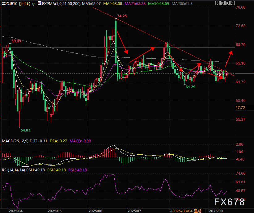 周一欧美时段,美原油10月期货合约上涨0.99%,目前交投于63.31附近,受到均线压制和箱体下沿支撑,油价维持震荡格局。当前市场处于美俄制裁对峙、原油供应过剩不确定性中,但是美联储降息预期升温(年内预计降息7 ...