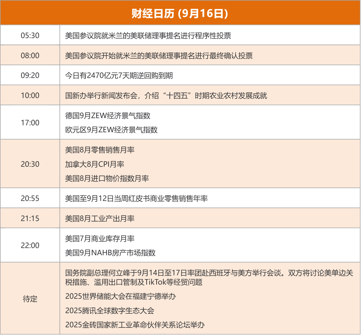 ![]() 每日精选中美经贸会谈: 当地时间9月14日至15日,中美经贸中方牵头人、国务院副总理何立峰与美方牵头人、美国财政部长贝森特以及贸易代表格里尔在西班牙马德里举行会谈。双方以两国元首通话重要共识为引领,就双方关注的经贸问题进行了坦诚、深入、富有建设性的沟通,就以合作方式妥善解决TikTok相关问题、减少投资障碍、促进有关经贸合作等达成了基本框架共识。双方将就相关成果文件进行磋商,并履行各自国内批准程序。 统一大市场: 9月16日出版的第18期《求是》杂志将发表中共中央总书记、国家主席、中央军委主席习近平的重要文章《纵深推进全国统一大市场建设》。文章强调,建设全国统一大市场,是党中央作出的重大决策,不仅是构建新发展格局、推动高质量发展的需要,而且是赢得国际竞争主动权的需要。我国作为全球第二大消费市场,必须把全国统一大市场建设好,增强我们从容应对风险挑战的底气。 英伟达反垄断调查: 市场监管总局于9月15日宣布,近日,经初步调查,英伟达公司违反《中华人民共和国反垄断法》和《市场监管总局关于附加限制性条件批准英伟达公司收购迈络思科技有限公司股权案反垄断审查决定的公告》,市场监管总局依法决定对其实施进一步调查。 北约对华关税: 有记者向外交部发言人林剑提问,近日,美方以中国进口俄罗斯石油为由,要求七国集团和北约成员国集体对华加征关税,推动中方在结束俄乌冲突上发挥作用,请问中方对此有何评论?林剑表示,美方的做法是典型的单边霸凌和经济胁迫。中方在乌克兰危机上的立场是一贯的、明确的。如果中方的正当权益受到损害,中方必将坚决反制,坚定维护自身的主权、安全和发展利益。 美日汽车关税: 据央视新闻报道,美国特朗普政府发布消息称,对日本汽车的进口关税将从美国东部时间16日0时1分(日本时间16日13时1分)起,下调至15%。 服务消费: 国务院新闻办公室将于2025年9月17日(星期三)下午3时举行新闻发布会,请商务部副部长盛秋平和国家发展改革委、文化和旅游部、中国人民银行有关负责人介绍扩大服务消费有关政策措施,并答记者问。 跨境投融资: 国家外汇管理局发布关于深化跨境投融资外汇管理改革有关事宜的通知,进一步提升跨境投融资便利。(一)取消境内直接投资前期费用基本信息登记。(二)取消外商投资企业境内再投资登记。(三)允许外商直接投资项下外汇利润境内再投资。(四)便利境内非企业科研机构接收境外资金。(五)扩大跨境融资便利。(六)简化跨境融资便利化业务登记管理要求。(七)缩减资本项目收入使用负面清单。(八)优化资本项目外汇收入支付便利化业务。(九)便利境外个人境内购房结汇支付。 中美关系: 9月15日,外交部发言人林剑主持例行记者会。法新社记者提问,据媒体报道,中方已邀请美国总统特朗普在今年访问中国,但由于双方在贸易和芬太尼问题上的分歧,美方尚未做出回应。中方对此有何回应?对此,林剑表示:“中美双方的沟通渠道是畅通的,关于你提到的具体问题,我没有可以提供的信息。” 预制菜争议: 连锁餐饮集团西贝的预制菜争议持续发酵。对此,记者获悉,北京市市场监督管理局已关注到相关信息,正进一步了解相关情况。资料显示,西贝品牌餐饮连锁门店的总公司为内蒙古西贝餐饮集团有限公司,其第一大股东为北京西贝企业管理有限公司。 汽车整车: 中国汽车工业协会15日发布《汽车整车企业供应商账款支付规范倡议》,围绕订单确认、交付与验收、支付与结算、合同期限等关键环节,对整车企业与供应商企业采购合同中相关内容作出规范倡议。倡议明确了货物交付验收、账期起计、对账结算、款项支付等要求,如明确货物验收时间原则上不超过3个工作日,倡导供货双方建立稳定合作关系、每次合同签订的有效期不少于1年。随后,上汽集团、比亚迪汽车、广汽集团、小米汽车、赛力斯等多家车企纷纷表态,积极响应协会倡议。 热点题材液冷: 据媒体消息,由于AI新平台Rubin与下一代Feynman平台功耗或高达2000W以上,现有散热方案无法应对,英伟达要求供应商开发全新“微通道水冷板(MLCP)”技术,单价是现有散热方案的3至5倍,水冷板、均热片成为新“战略物资”。另据媒体称,已有公司完成向英伟达送样MLCP。不过供应链人士坦言,MLCP并非AI服务器唯一解法,还有多个其他新散热方案在并行验证。 Ai应用: 随着谷歌Nano Banana图像生成模型爆火,美区App Store中谷歌Gemini下载量已超过ChatGPT,成为免费榜排名第一的应用。机构认为,谷歌Nano-Banana模型在多模态AI领域另辟蹊径,其SOTA图像生成和编辑能力、强角色一致性和闪电的速度,便于用户高效处理已有的图片素材,无论是在生产力场景还是创意场景,已展现出超强的实用性与惊人的图像效果,建议关注多模态模型与应用迭代带来的发展机会。 先进封装: 9月25-26日,2025先进封装及热管理大会将于江苏苏州举办,特设“先进封装产业创新大会&高算力热管理创新大会”两大平行论坛。AI、大模型、数据中心等高性能场景快速演进,芯片带宽、功耗、集成密度面临“功耗墙、内存墙、成本墙”三重瓶颈,传统工艺难以支撑性能跃升。先进封装凭借小型化、高密度、低功耗、异构集成等能力,正从制造后段走向系统设计的前端。 腱绳: 随着人工智能与机器人技术的飞速发展