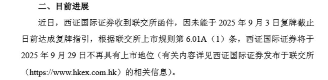 停牌一年多,西证国际证券迎来大结局! 9月15日晚间,西证国际证券发布公告称,9月12日收到联交所发出的函件,其中表示联交所上市委员会认定公司未能于2025年9月3日复牌截止日期前达成复牌指引,并决定根据有 ...
