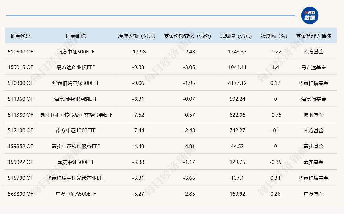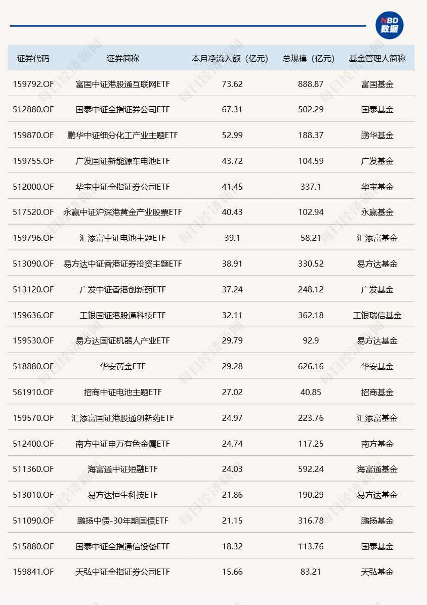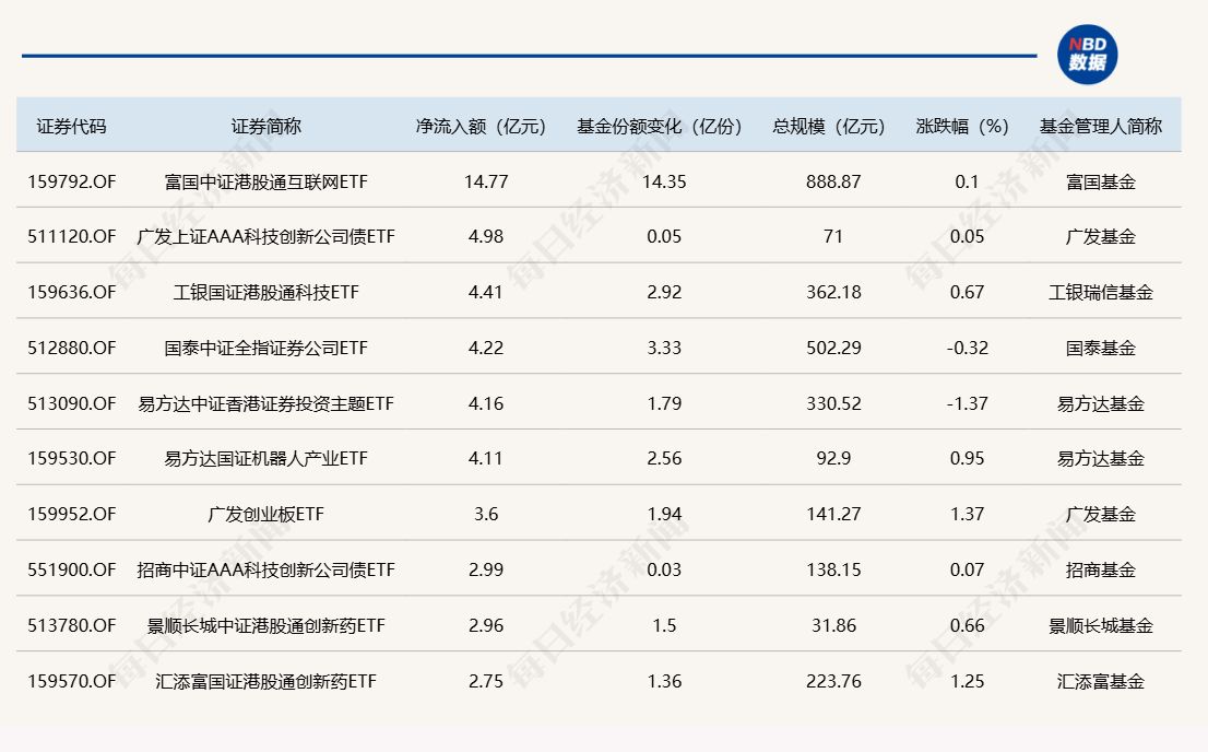 每经记者|肖芮冬 每经编辑|赵云 昨日市场走势分化,沪指窄幅震荡,创业板指冲高回落。板块方面,游戏、猪肉、汽车等板块涨幅居前,贵金属、文化传媒等板块跌幅居前。 Wind数据显示,在9月15日的非货币ETF市场中,富国中证港股通互联网ETF份额增加14.35亿份,净流入额14.77亿元;广发上证AAA科技创新公司债ETF份额增加0.05亿份,净流入额4.98亿元;工银国证港股通科技ETF份额增加2.92亿份,净流入额4.41亿元。 资金净流出方面,南方中证500ETF份额减少2.48亿份,净流出额17.98亿元;易方达创业板ETF份额减少3.06亿份,净流出额9.33亿元;华泰柏瑞沪深300ETF份额减少1.95亿份,净流出额9.06亿元。 截至9月15日,9月资金净流入额居前20的ETF名单如下: 总体看来,Wind数据显示,9月15日全市场ETF份额为29215.84亿份;总规模为52470.68亿元。近一周,份额增加最大的行业为金融,有24只基金跟踪。份额增加最大的主题为中证电池,有4只基金跟踪。份额增加最大的指数标的为证券公司,有13只基金跟踪;收益最高的指数标的为科创芯片设计(+11.35%),有1只基金跟踪。 |