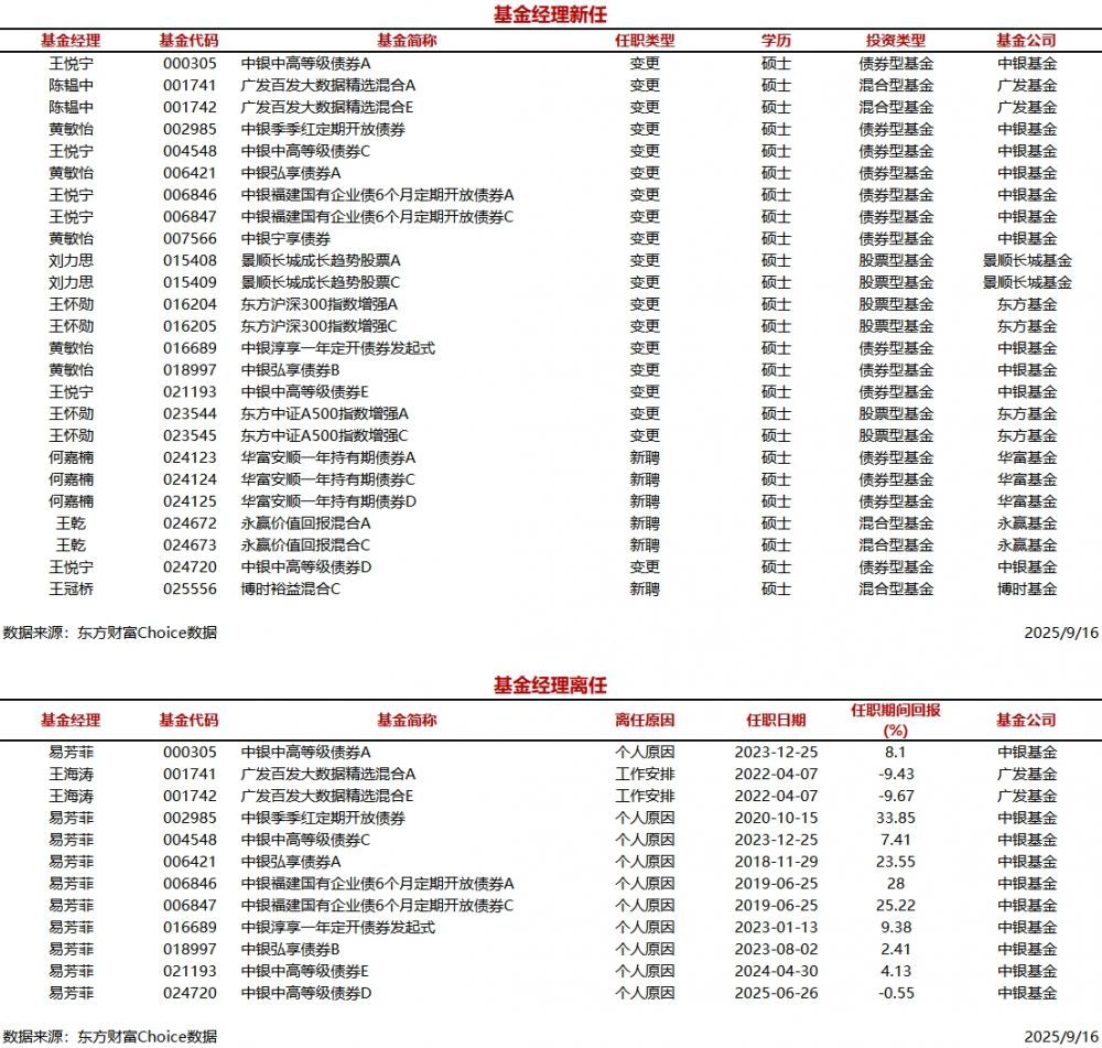每经AI快讯,据东方财富Choice数据统计,今日新聘基金经理8人,涉及25只基金(A/C类分开计算),主要来自中银基金、东方基金等公司。另外,今日有2位基金经理离任。