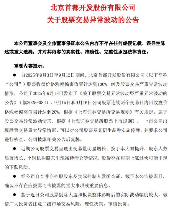 首开股份(600376.SH)公告称,自2025年9月3日至9月12日期间,公司股票收盘价格涨幅偏离值累计达到100%,触及股票交易严重异常波动情形,公司于2025年9月13日发布了《关于股票交易异常波动暨严重异常波动的公告》 ...