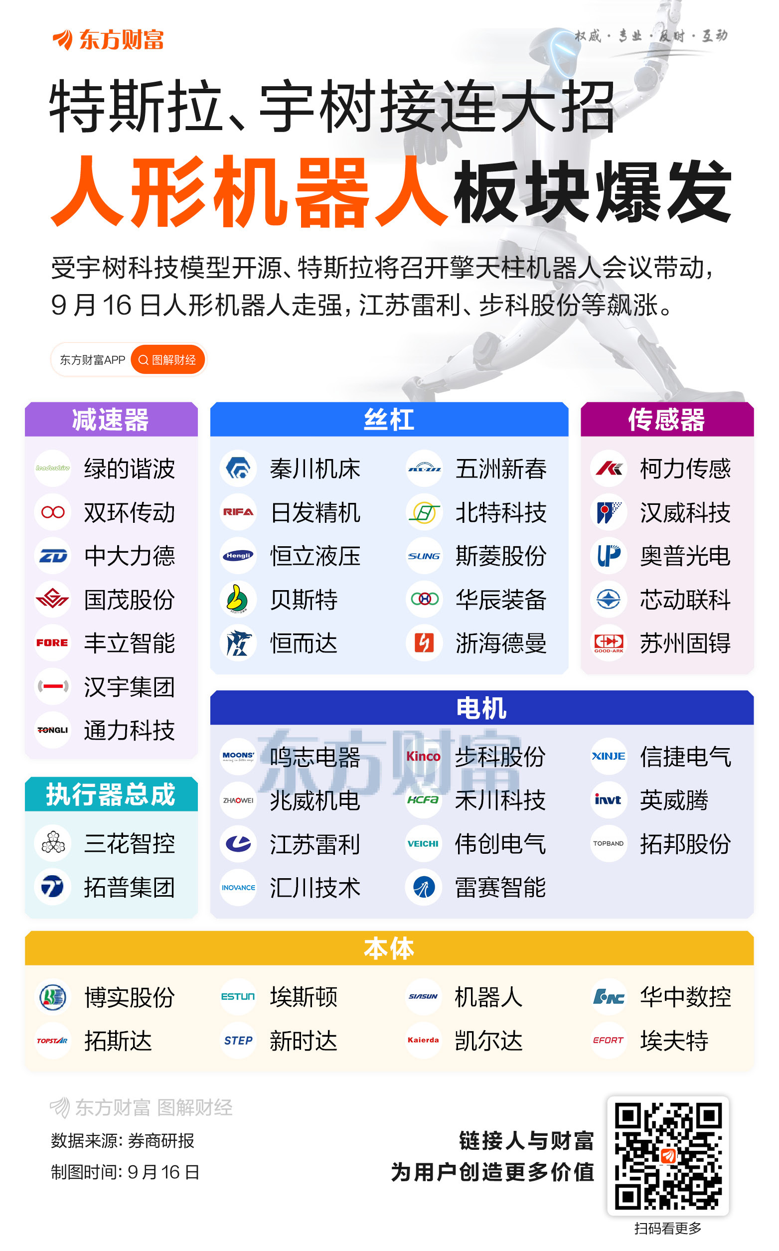 人形机器人产业链在9月16日表现强势,机器人执行器、人形机器人、减速器、同步磁阻电机等相关概念均居概念涨幅榜前列。个股而言,三花智控、双环传动、北特科技等多股涨停;江苏雷利、步科股份、斯菱股份、伟创 ...
