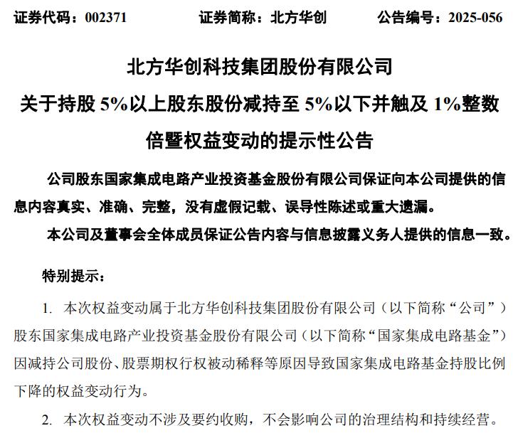9月16日,北方华创(002371.SZ)公告称,公司股东国家集成电路基金于2025年7月28日至2025年9月15日通过集中竞价减持259.19万股,占总股本0.357947%,并因股权激励行权被动稀释0.062843%。本次权益变动后,其持股由 ...
