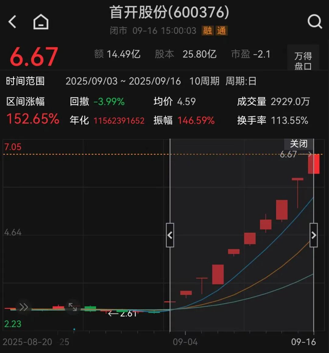 9月16日晚,首开股份披露股票异动公告称,近期公司股票交易呈现出交易量明显增长、换手率大幅提升、股东人数显著增长、个别机构股东出现减持清仓等情况,股价存在短期上涨过快可能出现的下跌风险。经过自查,公司不存在影响股票交易价格异常波动的重大事项,公司前期披露的信息不存在需要更正、补充之处,公司不存在应披露而未披露的重大信息。 首开股份还在公告中对市场热点进行回应称,其控股子公司盈信公司间接持有宇树科技约0.3%的股权。 Wind数据显示,9月3日至16日,首开股份10个交易日内收获9个涨停板,股价涨幅152.65%,换手率达113.55%。 ![]() 首开股份表示,9月3日至12日,公司股票收盘价格涨幅偏离值累计达到100%,触及股票交易严重异常波动情形,公司于9月13日发布了《关于股票交易异常波动暨严重异常波动公告》;9月15日和16日,公司股票连续两个交易日内日收盘价格涨幅偏离值累计达到20%,根据有关规定,属于股票交易异常波动情形。 首开股份提示称,根据《上海证券交易所股票上市规则》,上市公司出现股票交易重大异常情形,可以对公司股票及其衍生品种实施停牌,并要求公司进行核查,公司披露相关公告后复牌。 经公司自查,公司目前生产经营活动正常,主营业务未发生重大变化,公司目前仍处于亏损状态。上半年,公司营业收入180.4亿元,归母净利润亏损18.4亿元。 此外,截至公告披露日,公司、公司控股股东及实际控制人不存在影响公司股票交易价格异常波动的重大事项,不存在与公司有关的应披露而未披露的重大信息,包括但不限于筹划涉及上市公司的重大资产重组、股份发行、重大交易类事项、业务重组、股份回购、股权激励、破产重整、重大业务合作、引进战略投资者等重大事项。 公司提示,公司股价存在短期上涨过快可能出现的下跌风险。 公告显示,首开股份主要业务为房地产开发、物业经营、城市更新等创新业务。公司自2022年以来持续亏损。 (文章来源:中国证券报) |