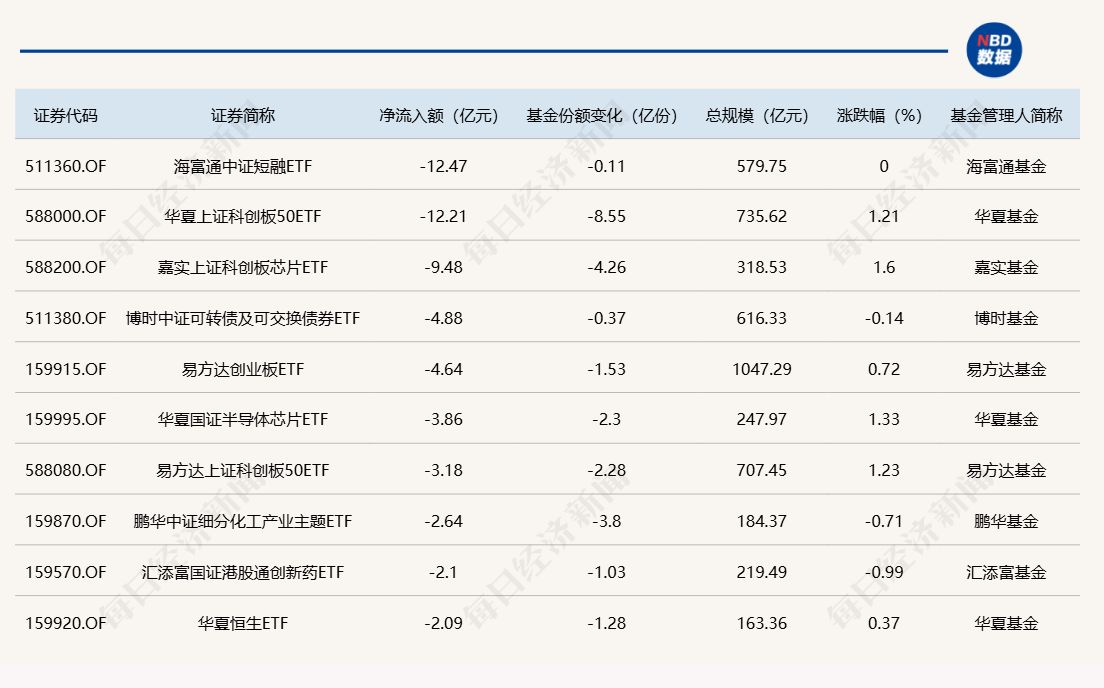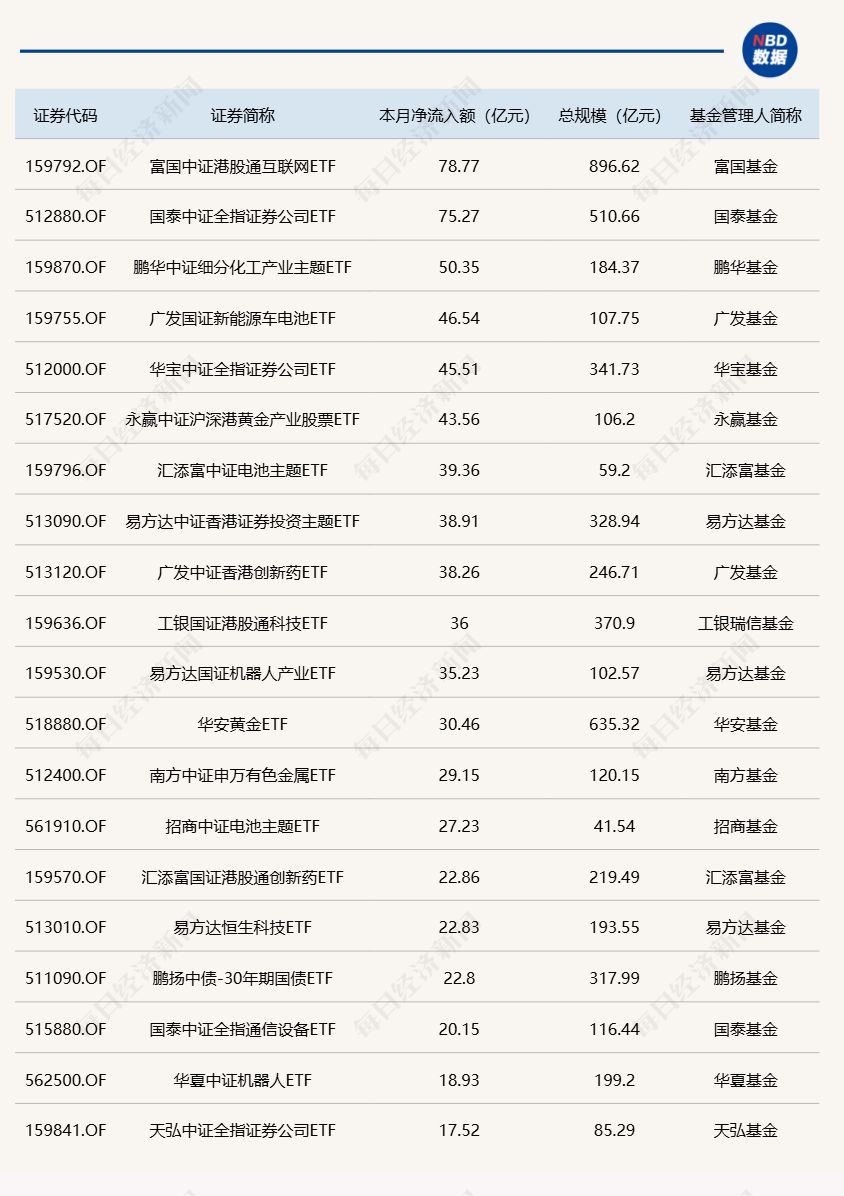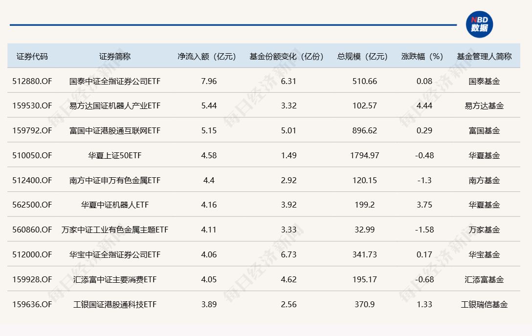 每经记者|肖芮冬 每经编辑|赵云 昨日市场震荡走高,中小盘股表现较强。板块方面,机器人、互联网电商、物流等板块涨幅居前,猪肉、有色金属、影视院线等板块跌幅居前。 Wind数据显示,在9月16日的非货币ETF市场中,国泰中证全指证券公司ETF份额增加6.31亿份,净流入额7.96亿元;易方达国证机器人产业ETF份额增加3.32亿份,净流入额5.44亿元;富国中证港股通互联网ETF份额增加5.01亿份,净流入额5.15亿元。 资金净流出方面,海富通中证短融ETF份额减少0.11亿份,净流出额12.47亿元;华夏上证科创板50ETF份额减少8.55亿份,净流出额12.21亿元;嘉实上证科创板芯片ETF份额减少4.26亿份,净流出额9.48亿元。 截至9月16日,9月资金净流入额居前20的ETF名单如下: 总体看来,Wind数据显示,9月16日全市场ETF份额为29231.16亿份;总规模为52574.70亿元。近一周,份额增加最大的行业为金融,有24只基金跟踪。份额增加最大的主题为中证电池,有4只基金跟踪。份额增加最大的指数标的为证券公司,有13只基金跟踪;收益最高的指数标的为科创芯片设计(+15.43%),有1只基金跟踪。 |
