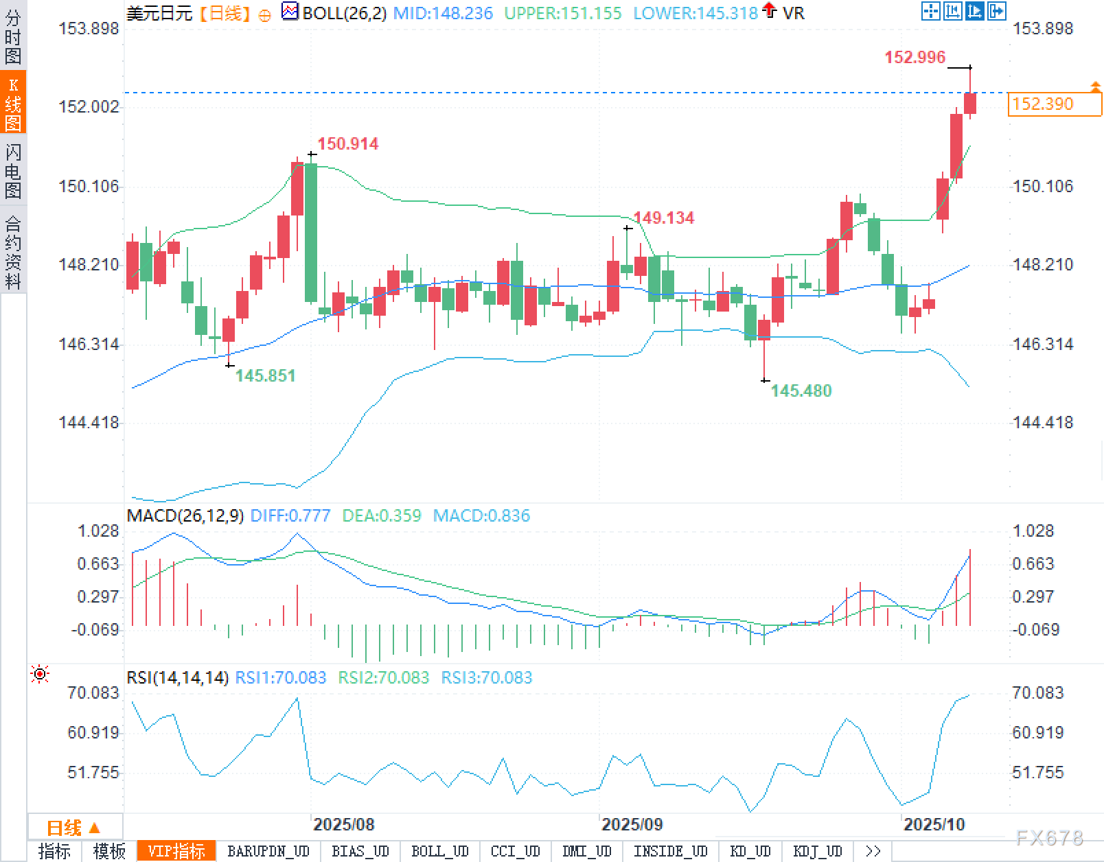 周三(10月8日),北美时段美元兑日元继续保持上行,于152.50附近交投,距当日高点152.996不远。自上周收盘以来,汇价累计拉升逾500点,刷新自1月末以来的新高。基本面与技术面同向共振,叠加外部风险偏好回落,形 ...