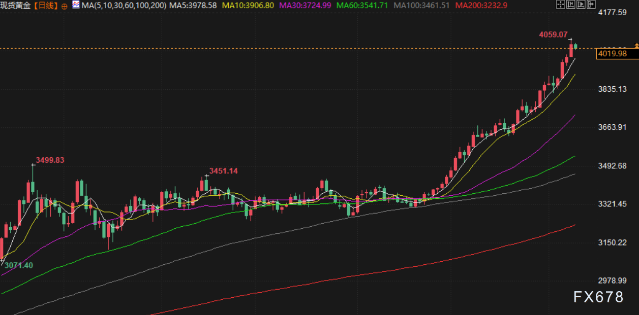 周四(北京时间10月9日)亚市早盘,现货黄金交投于4020美元/盎司附近,现货黄金周伞首次突破每盎司4000美元大关,延续破纪录涨势至4059.07美元/盎司。地缘政治与经济不确定性加剧,以及市场对美国降息的预期,促使投资者涌入避险资产;美原油交投于62美元/桶附近,油价周三创一周新高,交易商预计乌克兰和平协议缺乏进展将使对俄罗斯的制裁继续有效,同时报告显示美国石油消费增长。 ![]() ![]() 美股周三收高,受科技股提振,美国政府停摆导致经济数据缺失,投资者转而关注美联储最近一次政策会议记录,以寻找利率前景的线索。 以科技股为主的纳斯达克指数涨幅居前,受人工智能相关的大型科技股推动,这些股票今年以来一直是市场上涨的主要动力。标普500指数和纳指均创下收盘新高,道指则基本持平。 芯片股表现尤为突出,而能源、消费必需品和住宅建筑商板块则表现落后。美国抵押贷款银行协会(MBA)的一份报告显示,尽管利率有所回落,上周购房贷款需求仍下降4.7%。 美国银行资本市场研究主管Bill Merz表示,, “市场主题仍是激进增长,与人工智能相关的交易接连不断地宣布,任何与AI沾边的事都受到极大关注。 在AI持续受到热捧的背景下,美国国内及地缘政治不确定性上升,推动黄金突破每盎司4000美元大关,投资者买入黄金对冲风险。 Merz补充道,过去几年我们看到,股票和避险资产可以同时上涨,部分原因在于这种双重现实:一方面基本面目前支持高于正常水平的估值,另一方面赤字支出必须通过新增债务融资。 美国政府停摆已进入第八天,国会僵局意味着市场参与者在短期内将缺乏官方经济指标,市场只能等待下周开始的第三季财报季提供线索。 在数据缺失的情况下,投资者关注下周开始的第三季财报季,以及联邦公开市场委员会(FOMC)9月会议记录,以判断美联储是否会进一步降息。 会议记录显示,FOMC内部意见分歧,政策制定者对劳动力市场风险上升表示担忧,但仍对通胀保持警惕。尽管“大多数决策者认为今年余下时间进一步放松政策可能是合适的”,但进一步行动的时机和节奏仍不确定。 Horizon Investments投资组合管理主管Zachary Hill表示,当前讨论的焦点是美联储降息的幅度,以及政策是否仍具限制性,更广泛来看,在政府停摆持续的情况下,美联储缺乏公共部门经济数据,这使得其本已艰难的工作变得更加复杂。” 金融市场目前预计美联储将在本月政策会议结束时降息25个基点的可能性为92.5%。会议定于10月29日举行。 道琼斯工业指数下跌0.00%,报46601.78点;标普500指数上涨0.58%,报6753.72点;纳斯达克指数上涨1.12%,报23043.38点。 标普500指数11个主要板块中,科技股涨幅居首,能源股跌幅最大。 金价飙升提振美国上市的黄金矿商Newmont 和Gold Fields,分别上涨1.7%和3.7%。戴尔上涨9.1%,多家券商上调其目标价。AMD 跳涨11.4%,连续第三日上涨。本周该芯片制造商股价已累计上涨逾43%。 金市 金价周三首次突破每盎司4000美元大关,延续破纪录涨势。地缘政治与经济不确定性加剧,以及市场对美国降息的预期,促使投资者涌入这一避险资产。 ![]() 现货金上涨1.7%,报每盎司4050.24美元;美国12月期金结算价上涨1.7%,报4070.5美元。现货银上涨3.2%,报每盎司49.35美元,盘中一度触及历史高点49.57美元。 Metals Focus黄金与白银主管Matthew Piggott表示,金价的强劲走势反映出当前宏观经济和地缘政治背景极为有利于避险资产,同时也反映出市场对其他传统避险资产的担忧。 继2024年上涨27%之后,今年迄今金价已上涨52%,成为2025年表现最好的资产之一,涨幅超过全球股市,而美元和原油则下跌。银价今年迄今上涨71%,受益于与黄金相同的利多因素,同时现货市场供应紧张也提供支撑。 金银上涨的背后是多重因素共振,包括美国降息预期、政治与经济不确定性上升、各国央行强劲买盘、ETF资金流入增加以及美元走软。 Piggott补充道,鉴于这些因素将持续至2026年,我们目前看不到金价出现明显回调的催化剂。因此,我们预计金价将在今年持续走高,并有望挑战每盎司5000美元关口。 根据世界黄金协会(WGC)的数据,全球黄金ETF今年以来的资金流入已达640亿美元,仅9月就创下173亿美元的单月纪录。分析师指出,“害怕错过”(FOMO)情绪也在助推这轮涨势。 从技术面看,黄金的相对强弱指数(RSI)已达88,显示该资产处于超买状态。 汇丰银行周三上调了2025年和2026年银均价预测,分别至每盎司38.56美元和44.50美元,理由是金价高企、投资者需求回暖以及交易波动性预期上升。 涨势也蔓延至其他贵金属。铂金上涨2.8%,至每盎司1660.78美元;钯金上涨7.2%,至每盎司1434.25美元,创2023年6月以来新高。 油市 油价周三上涨逾1%,创一周新高,原因是交易商预计乌克兰和平协议缺乏进展将使对俄罗斯的制裁继续有效,同时一份周度报告显示美国石油消费增长。 ![]() 一位俄罗斯高级外交官表示,与乌克兰达成和平协议的动力已基本耗尽。分析人士称,和平协议可能会让更多的俄罗斯石油流向全球市场。美国能源数据显示,2024年俄罗斯是仅次于美国的全球第二大原油生产国。 据国际文传电讯社(Interfax)报道,俄罗斯副总理诺瓦克周三表示,尽管受到制裁,俄罗斯仍在逐步提高石油产量,上个月已接近达到OPEC+组织的产量配额。 在过去的两个月里,由于乌克兰主要针对炼油厂的一波又一波的无人机袭击,令俄罗斯的能源行业承受着严重的压力。 