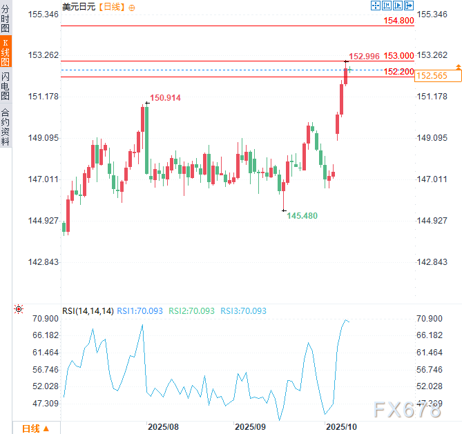 本周日元已成为空头最青睐的标,因一位主张强力刺激的候选人在日本首相角逐中领先。日元交叉汇率全线飙升,美元空头回补推动美元兑日元本周累计上涨3.6%。周四(10月9日)亚市时段,美元兑日元未延续前五个交易日涨势,现于152.55附近震荡。 ![]() 虽然现在断定日元交叉汇率已见顶为时过早,但波动率下降和超买信号表明看涨动能可能在周末前减弱。这将导致横盘整理还是深度回调,很大程度上取决于市场如何解读高市早苗的货币政策立场。 ![]() 结合日内振幅指标进行分析发现,虽然美元兑日元此前已连续五个交易日上涨,一度达152.99的近八个月高点,但其日内波动幅度近三个交易日持续收窄。这或许尚不构成明确的见顶信号,但确实表明多头动能正在减弱。 周三K线虽呈现较长上影线,但尚未形成射击之星这类经典反转形态。 美元兑日元在近期飙升后于153.00关口下方暂缓走势,汇价目前维持在152.45-152.55高成交量节点区域附近震荡。短期结构表明汇率可能先向152.20-152.25支撑区域小幅回调,随后再次测试153.00阻力带。 若有效突破153.00关口,上涨行情有望延续至153.80-154.00区间;但若未能守住152.20支撑位,则可能引发更深层次回调,下探151.70或3月高点151.30附近区域。 目前重要阻力位位于154.80水平。不过多头需警惕153与154整数关口附近可能出现的阻力,同时月度R1枢轴点154.52同样构成关键阻力位。 ![]() 北京时间10:15,美元兑日元交投于152.52/53。 ![]() |