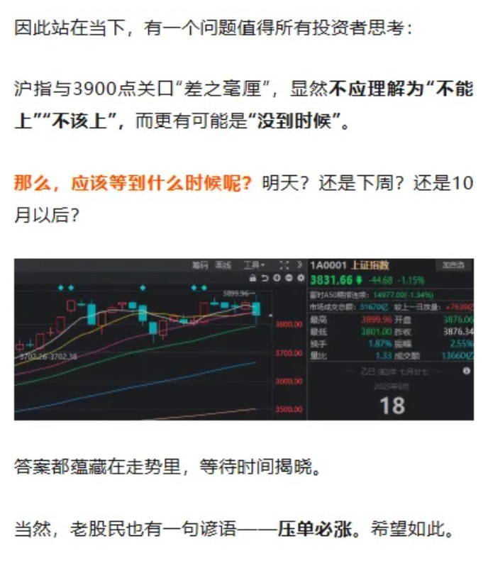 每经记者|肖芮冬 每经编辑|叶峰 10月9日,沪指高开高走突破3900点整数大关,刷新2015年8月以来新高。截至收盘,沪指涨1.32%,深成指涨1.46%,创业板指涨0.73%。 板块方面,有色金属、核电、稀土永磁等板块涨幅居前,影视院线、旅游、教育等板块跌幅居前。 全市场超3000家上涨,共有99只个股涨停。沪深两市成交额2.65万亿元,较上一个交易日放量4718亿。 今天,节后首个交易日,A股的“开门红”,红得有些发烫。 最受关注的无疑是沪指放量突破,时隔十年(2015年8月以来)重新站上了3900点关口,盘中最高触及3936.58点。 这一标志性事件,该如何理解呢? 首先我们认为,超预期的走势“虽迟但到”,正是对相信趋势者的“奖励”。 日线来看,本轮3900点“攻坚战”,始于8月25日,算上今天(毕竟盘初还有一点犹豫)共经历了28个交易日的反复震荡,5次冲关失败。 而实际上,此前沪指在“初次站上→完全站稳”3400点时,同样经历了较长时间的蓄势,具体来说是30个交易日。 自今年4月反弹以来,指数的“慢牛”走法深入人心,或者说,市场也在有意“培养”股民对此的共识——不必预言它的涨跌,跟随趋势即可。 其次,我们认为需要指出一个细节——今天指数突破箱体、突破整数关口,显然受到“牛市旗手”的带动。 如下图所示,上午10:05~10:14,正是证券板块的快速翻红,令指数完成了“临门一脚”。 这一点的意义在于,此前沪指多次冲击3900点未果,都受到了大金融板块的“压制”。在9月18日的推送中,我们就探讨过这个问题: 3900点不是“不能上”,而是“没到时候”,那么该等到何时? 西部证券研报称,低基数效应下证券行业2025Q3业绩或维持同比高增,经纪和自营业务预计仍是利润增长主要贡献。其认为,证券行业三季度或实现672亿元净利润(中性假设),同比+87%,环比+20%;2025年1-3季度累计实现净利润或1800亿元(中性假设),同比+55%,维持高增;行业年化ROE提升至7.7%。 “证券行业景气上行趋势未改,仍是年内不可多得的相对低估+业绩同比高增的细分资产。行业景气度提高、未来潜在并购重组主线新进展和金融科技新变化,使板块估值具有一定修复空间。” 不过,从绝对涨幅来看,证券板块并非日内最强。或者说,券商要是再多发点力,今天指数的表现会更夸张。 极致的赚钱效应,更多体现在假期充分发酵的两大方向——科技和有色金属,不过前者尾盘出现回落。这里大致盘点下逻辑。 (1)有色金属 国庆假期期间,国际黄金价格持续大涨,伦敦现货金与COMEX黄金期货价格双双突破4000美元/盎司,创历史新高。10月9日,国内黄金期货主力合约直接高开逾900元之上,截至午间收盘,放量大涨4.77%,报收913.9元,亦刷新历史纪录。 西部证券认为,黄金正在迎来“第三浪”:第一波涨幅是2016年起“全球贸易-美元结算”体系松动,黄金的交易价值让位给储备价值;第二波涨幅是2022年起,美国将俄罗斯排除出Swift系统,损害美元信用;第三波涨幅从今年9月18日的非常规降息开始,进一步影响美联储独立性。 (2)可控核聚变 据央视新闻此前报道,中国核聚变装置BEST主机全面开建,该装置在国际上将首次验证演示核聚变发电,我国有望2030年用核聚变发电。 中航证券指出,聚变堆撬动万亿蓝海市场,推动中上游环节产业化提速:根据FIA的调查,高温超导、第一壁材料、低温系统、热交换器、真空室等一系列材料和零部件被多数企业视为装置的关键部分,而下游总装企业对氩和氲燃料、燃料循环系统、第一壁材料、特种金属等环节在未来的批量化供应仍有隐忧,上述环节的产业化进程值得关注。国内核聚变链主企业的招标建设将带动上游材料及中游加工企业共享行业初期高增长的红利,行业卖铲人将率先受益。 (3)科技线 半导体产业链盘中大涨,存储芯片、先进封装等板块涨幅一度居前。值得注意的是,偏“国产链”的走强,也引起了“海外链”的相对走弱;芯片股午后明显回落,中芯国际翻绿。 分析认为,主要有四大催化。 一是受产品涨价消息驱动,美股存储芯片股近期持续上涨。据央视新闻报道,9月下旬,韩国三星电子向主要客户发出第四季度提价通知,计划将部分DRAM价格上调15%至30%,NAND闪存价格上调5%至10%。美国芯片制造商美光在9月一度暂停部分存储芯片报价,恢复报价后,新价格普遍上涨约20%。另一存储芯片巨头闪迪也已在9月上调NAND闪存报价,幅度约为10%,消费级与企业级产品均有涉及。 二是OpenAI大动作不断。当地时间10月6日,OpenAI在其官网表示,与AMD达成一项战略合作。OpenAI将部署6吉瓦AMD GPU算力,使用AMD Instinct系列GPU为其下一代人工智能基础设施提供动力支持。 OpenAI首席执行官萨姆·奥尔特曼(Sam Altman)还表示,更多这样的交易正在进行中。当被问及最近的这些交易时,奥尔特曼说:“你应该在未来几个月对我们有更多的期待。” 三是日前高盛上调中芯国际和华虹半导体港股目标价,将两家公司的目标价均上调至117港元/股。 四是日前Meta Connect大会举行,多款智能眼镜新品集中亮相。 另有报道称,中国的科技板块尤其受到国际机构的高度关注。阿里巴巴、腾讯、百度等科技龙头企业的目标价被显著上调。高盛强调,阿里云在AI基础设施和应用方面取得的进展使得其目标价上调至179美元。花旗亦看好腾讯在AI领域的能力提升,将目标价定为735港元。杰富瑞则显著提升了百度的目标价,认为其在AI领域的快速发展备受市场关注。 封面