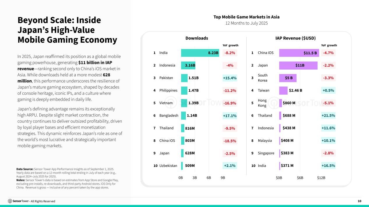 策略类游戏之外,中国二次元游戏也在TGS上大放异彩。据本次参展的业内人士向记者描述,在前往会场的千叶线电车上,有完美世界《异环》横幅海报;在距展馆最近的海滨幕张站,能看到蛮啾网络《蓝色星原:旅谣》欢迎海报;再往里走,则是网易《无限大》以及再次亮相的《异环》,这些海报吸引了大量玩家的目光。 位于主展厅的核心展台也给到了中国游戏。中国企业叠纸携旗下自研产品《无限暖暖》《恋与深空》以C位亮相,与全球玩家亲密互动。这是叠纸旗下两大头部新品首次联合参展TGS,也是《恋与深空》在上个月代表中国游戏斩获德国科隆游戏展“最佳移动游戏奖”后,再次亮相世界级展会。 “这是现场排队最长的一款游戏。”德国科隆游戏展在授予叠纸《恋与深空》“最佳移动游戏奖”时曾如此介绍。时隔1个月的TGS现场,叠纸展台再现火爆场面。 《无限暖暖》是叠纸推出的全球首款基于UE5引擎打造的多平台开放世界游戏,本次展会上,其在国内展会上好评如潮的“世界名画墙”首次走出国门。作为叠纸旗下“暖暖”IP(具有商业价值的创意内容或品牌)的第五代作品,《无限暖暖》延续了“暖暖”系列备受玩家喜爱的美好治愈风,自去年12月上线以来就收获全球玩家喜爱以及权威媒体好评。 “长线运营”+“本土化”:中国厂商日本市场逆风破局 在全球游戏展会的舞台上,中国游戏在不同展会的境遇形成了鲜明对比。前不久的德国科隆游戏展,虽然中国游戏厂商在发布会中占据重要位置,游戏影片也十分重磅,但欧美老牌经典IP和大作依然是现场关注的焦点。 而在TGS,中国游戏展现出了强大的势能。上述连续多年参加TGS的业内人士表示:“在科隆展,中国游戏像是努力融入却有些格格不入的外来者;但在TGS,中国游戏明显更受欢迎,日本玩家和媒体对中国游戏的接受度非常高。” 这一方面是因为日本玩家、媒体对手游等多样化形式游戏接受程度更高;另一方面,国产游戏多年来的文化逆输出,已经在日本市场取得了显著成效。据称,在TGS现场能明显感受到这种氛围的升温,日本玩家对《Whiteout Survival》等中国产品充满期待,从现场试玩的排队长度就能窥见一斑。 从市场规模看,日本游戏市场的规模虽不及美国和中国,但其“含金量”却稳居全球前列。根据SensorTower发布的《2025日本游戏市场洞察报告》,2025年日本手游市场仍是全球的“价值天花板”——110亿美元(约合人民币784亿元)的IAP(应用内购买)收入占据全球第二席位,玩家ARPU(每用户平均收入)值更是达到欧美市场的1.8倍。