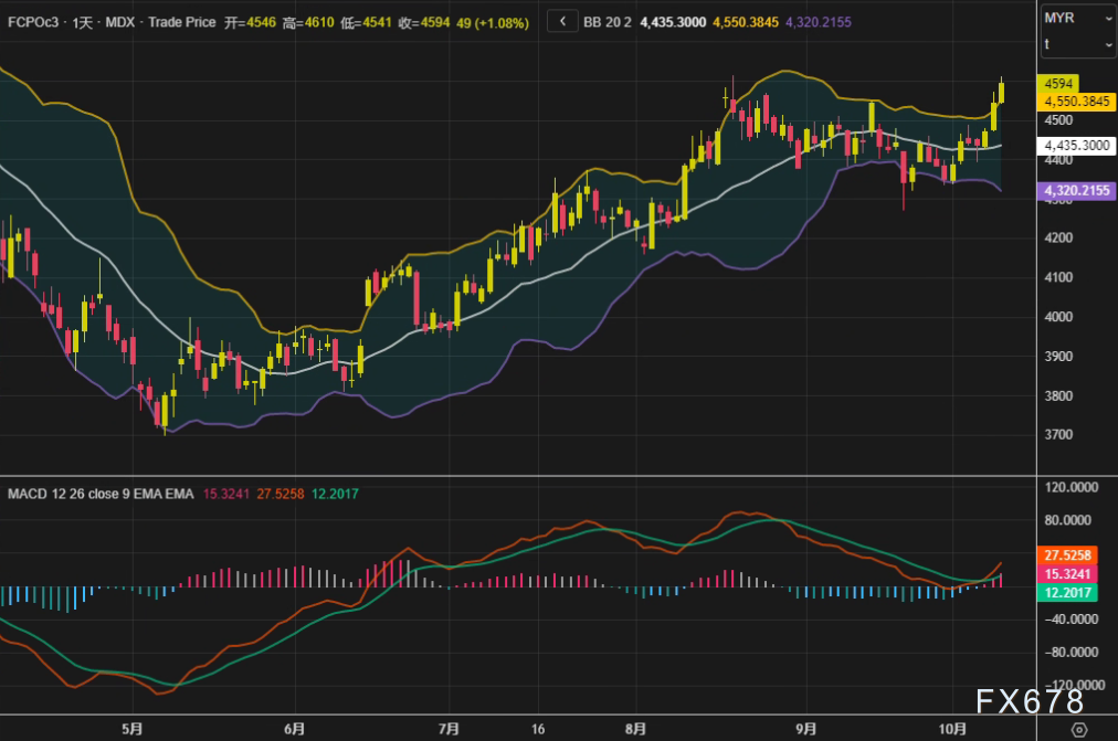 周四(10月9日),马来西亚衍生品交易所棕榈油主力合约收于4594林吉特/吨,单日涨幅1.08%,创下自3月7日以来的七个月收盘新高。至此,棕榈油已连续三个交易日走强,市场情绪在印尼生物柴油新政与中国节后补库的双 ...