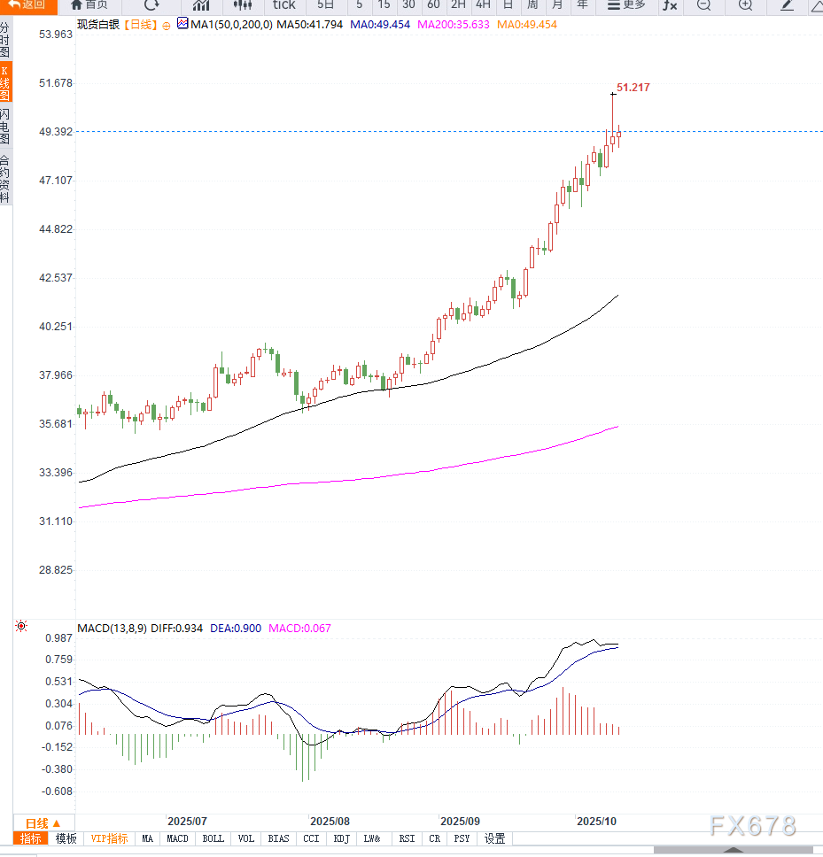 周五亚洲交易时段,现货白银(XAG/USD)延续强势上涨,交投于每盎司49.70美元附近。银价已连续多个交易日保持在高位区间,反映出市场对避险资产的强劲需求。 ![]() 白银协会(Silver Institute)首席执行官Michael DiRienzo表示: “全球经济的不确定性显著增加,而在这种环境下,投资者倾向转向实物资产,例如白银。” 其次,美联储的政策预期成为银价上涨的重要推手。根据CME FedWatch工具显示,市场当前预计美联储在10月会议上有近95%的概率降息25个基点,而12月再次降息的概率略降至82%。 利率下行将降低持有无收益贵金属的机会成本,从而支撑白银价格。 在工业需求方面,白银在新能源、电子与光伏领域的消费持续增长,也为其提供了中期支撑。随着制造业数据回暖,市场预期工业金属需求将保持稳定。 从日线图来看,银价突破49.50美元关键阻力后,技术面明显偏强。均线系统呈多头排列,MACD指标持续放量,显示上行动能充足。若价格稳守49.30美元上方,后市有望测试50美元整数关口及50.80美元的心理高位。 相反,若出现获利回吐,48.80美元将成为短期支撑位。整体来看,银价处于上升通道中,短线虽有调整风险,但趋势依旧偏向多头。 市场分析师Lallalit Srijandorn指出: “白银的上涨不仅反映避险买盘,还体现市场对美联储宽松周期的提前定价。若降息落地,银价突破50美元关口只是时间问题。” ![]() 当前银价的上涨具备宏观与技术双重支撑。尽管短期可能受美元波动或消费者信心数据影响而出现震荡,但避险需求与降息预期的叠加,构成银价坚实的底部支撑。 若美联储释放更强烈的宽松信号,银价有望进入新的上升周期。 ![]() |