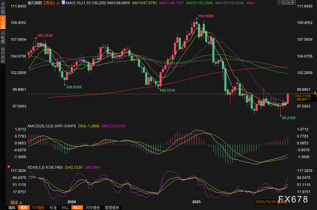 本周,美元指数表现亮眼,尽管美国政府停摆进入第二周,美元依然稳如磐石。周五(10月10日)亚欧时段,美元指数略有回落,目前99.33附近,仍接近周四创下的两个月高点99.55,本周迄今仍上涨1.7%,有望创下一年来最佳周度表现。