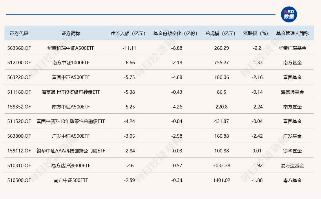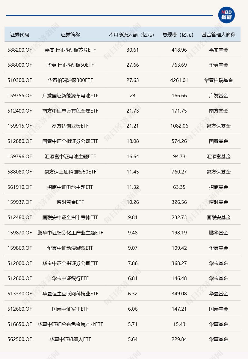 每经记者|肖芮冬 每经编辑|赵云 上周五市场震荡调整,三大指数集体下跌,黄白二线分化明显。板块方面,燃气、煤炭等板块涨幅居前,半导体、电池、贵金属等板块跌幅居前。 Wind数据显示,在10月10日非货币ETF市场中,华夏上证科创板50ETF基金份额增加21.29亿份,净流入额为32.95亿元;嘉实上证科创板芯片ETF基金份额增加10.95亿份,净流入额为27.48亿元;华泰柏瑞沪深300ETF基金份额增加3.34亿份,净流入额为15.87亿元。 与此同时,华泰柏瑞中证A500ETF基金份额减少8.88亿份,净流出额为11.11亿元;南方中证1000ETF基金份额减少2.18亿份,净流出额为6.66亿元;富国中证A500ETF基金份额减少4.68亿份,净流出额为5.75亿元。 截至10月10日,本月资金净流入额居前20的ETF名单如下: 总体看来,Wind数据显示,10月10日全市场ETF份额为30386.47亿份;总规模为56177.70亿元。近一周,份额增加最大的行业为金融,有24只基金跟踪。份额增加最大的主题为中证电池,有4只基金跟踪。份额增加最大的指数标的为CS电池,有4只基金跟踪;收益最高的指数标的为工业有色(+6.63%),有1只基金跟踪。 |
