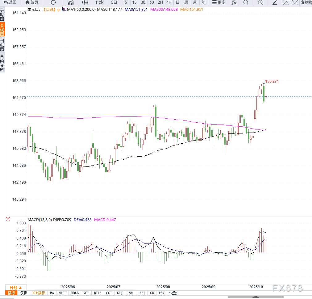 周一亚洲交易时段,美元兑日元维持在152.00附近,日元整体承压。由于日本国内政治局势动荡与市场流动性低迷,避险需求难以有效支撑日元反弹。 ![]() 尽管双方言辞激烈,但特朗普随后缓和语气,称“亚洲国家经济会没问题,美国希望帮助而非伤害”,此言论短暂提振了市场风险偏好,令日元承压。 此外,日本国内政治不确定性上升。公明党宣布结束与自民党长达26年的执政联盟,使得高市早苗成为日本首位女性首相的竞选之路蒙上阴影。政治动荡引发投资者担忧,也成为日元走弱的推手之一。 从货币政策角度看,市场仍预计日本央行年内可能加息一次,而美联储则被广泛认为将于年内降息两次。两国央行的政策分歧在短期内将继续抑制美元兑日元的下行空间。 与此同时,美国政府停摆仍在持续,预算僵局导致数千名联邦雇员停薪休假,这令美元多头保持谨慎,但尚不足以改变美元的中期支撑格局。 从日线级别来看,美元兑日元仍处于强势整理阶段。汇价在上周触及153.25的八个月高点后小幅回调,目前稳于5日均线与10日均线上方。 MACD指标维持红柱延展,RSI接近70水平,显示短线多头动能仍充足,但存在轻微超买迹象。若价格持续站稳152.20(100小时均线)上方,将确认新的上行动能,目标指向152.70-153.00区域; 若跌破151.00支撑,或触发回调至150.70甚至150.00一线。整体结构仍为震荡偏强。 Karobaar Capital分析师Haris Khurshid表示:“除非日本政府迅速稳定政治格局,否则日元短线反弹将受限。美元兑日元若突破153,将打开新的上行通道。” ![]() 美元兑日元的走势在政治与政策双重影响下短期波动加剧,但整体多头趋势仍未改变。若美国经济数据维持稳健、且美联储降息幅度低于预期,美元兑日元有望维持强势区间运行。 ![]() |