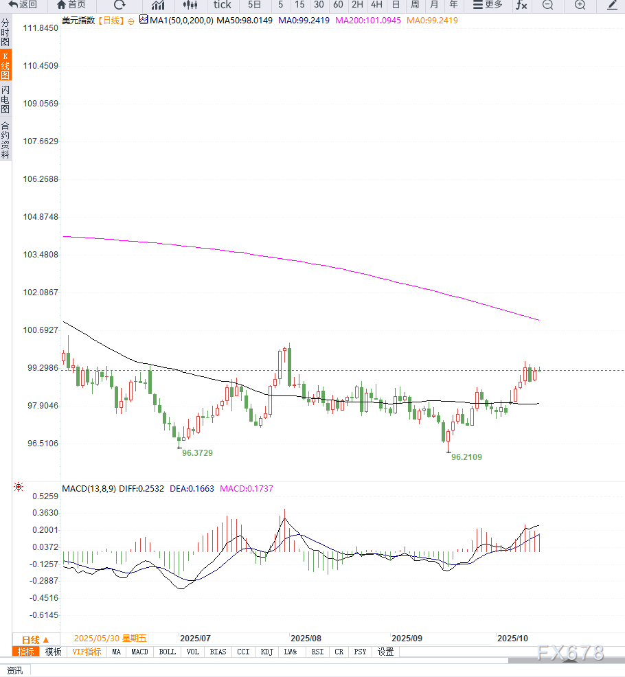 从技术走势来看,DXY在99.00至99.50区间维持震荡整理,短线支撑位于98.80,若跌破该水平,可能进一步回落至98.40。上方阻力位在99.60和99.85,为突破前高所需关键区间。