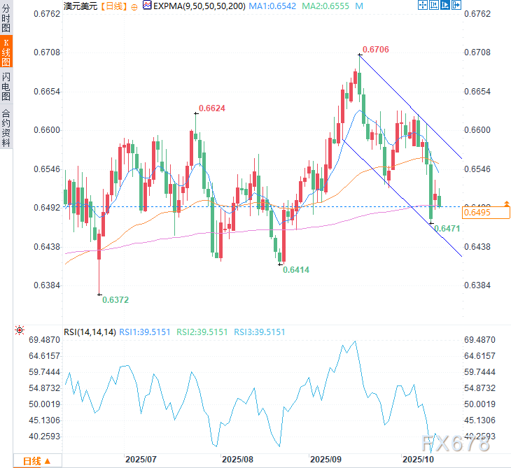 周二(10月14日)亚市时段澳元兑美元走低。澳洲联储公布9月货币政策会议纪要后,澳元未受到提振,反而市场谨慎情绪为美元提供支撑。纪要显示理事会成员一致认为当前政策仍略显紧缩,但难以精确评估紧缩程度。 ![]() 上周澳洲联储主席米歇尔·布洛克强调服务业通胀仍具粘性后,市场情绪保持谨慎。她承认第二季度通胀略超预期,但强调通胀正持续朝着正确方向回落。 澳大利亚10月消费者通胀预期从先前的4.7%升至4.8%,创6月以来最高水平。市场对第三季度通胀可能超预期的担忧加剧,这强化了澳洲联储维持谨慎政策立场的预期。 市场普遍预计,在9月将官方现金利率维持在3.6%不变后,澳洲联储将继续按兵不动。 美联储主席鲍威尔讲话前美元持稳 美元指数目前持稳,现交投于99.20附近。市场正密切关注美联储主席杰罗姆·鲍威尔将于今日晚些时候发表的讲话。 根据CME FedWatch工具显示,市场目前预计美联储10月降息的概率高达97%,12月再次降息的概率为92%。 费城联储主席安娜·保罗森周一表示,就业市场风险上升支持美联储进一步降息,因为关税措施目前看来不太可能如预期般推高通胀。 9月联邦公开市场委员会会议纪要表明,政策制定者倾向于今年进一步降息。多数政策制定者支持9月降息,并暗示今年晚些时候将进一步放松政策。然而部分成员主张采取更谨慎的态度,理由是对通胀的担忧。 美国总统特朗普上周五称,没有必要在两周后于韩国举行的峰会上与中国领导人会晤,并宣布计划对中国进口商品征收100%关税。但周日他在Truth Social平台发表缓和言论,表示中国经济“将会好转”,美国希望“帮助中国而非伤害中国”。 澳大利亚总理部门泄露的简报显示,政府官员已开始与矿商商讨共同建立12亿澳元(7.7628亿美元)的“关键矿产战略储备”。根据拟议中的美澳资源协议,澳大利亚正考虑为关键矿产设定最低价格,并为新稀土项目提供资金支持。 技术分析 日线图技术分析显示,由于澳元兑美元在下降通道内持续走低,整体趋势仍偏向看跌。 14日相对强弱指数(RSI)持续位于50中性线下方,强化了看跌前景。 下行方面,澳元兑美元可能下探下降通道下轨0.6460附近。若有效跌破该通道下轨,将巩固看跌趋势,推动汇价测试8月21日创下的四个月低点0.6414,继而下探五个月低点0.6372。 上行方面,初始阻力位见于9日指数移动平均线0.6542,随后是50日指数移动平均线0.6555。若能突破这些均线阻力,将改善中短期价格动能,推动澳元兑美元上探下降通道上轨0.6600附近。若进一步突破通道上轨,则看涨趋势将开始显现,支撑汇价上探9月17日创下的12个月高点0.6707附近。 ![]() 北京时间11:54,澳元兑美元交投于0.6496/97。 ![]() |