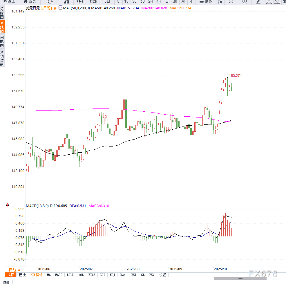 日本自由民主党与公明党联盟破裂后,新当选的自民党党首高市早苗正等待议会投票确认成为日本首位女性首相。 ![]() 尽管如此,市场避险资金仍偏向美元资产。美国政府停摆已进入第三周,部分经济数据推迟公布,使得市场更加依赖美联储官员讲话来判断政策方向。周二美联储主席鲍威尔的发言预计将成为推动汇率波动的关键。 日线图形结构来看,美元兑日元在连续回踩151.70支撑后形成明显的“高低点抬升”结构,显示出中期上行趋势依旧完好。 目前价格位于20日与50日均线之上,技术指标MACD持续维持正向动能,RSI处于65附近,显示多头力量仍占优。若汇价突破152.80至153.00阻力区,将打开进一步上探153.25—153.50区域的空间;若受阻回落,则151.70将成为短期重要支撑。 分析师Koji Tanaka指出:“只要美元兑日元稳定在151.50上方,市场的整体结构仍偏多头,153.00为下一个关键观察位。” ![]() 从当前市场格局看,美元兑日元的强势并非单一政策驱动,而是政治不确定性与全球风险偏好共振的结果。若日本国内政治动荡持续,同时美联储延缓降息节奏,汇价或进一步测试153.50甚至154.00区域。 但若鲍威尔在讲话中释放更强烈的宽松信号,则短线可能迎来获利回吐压力。总体来看,汇价维持高位震荡格局的可能性较大。 ![]() |