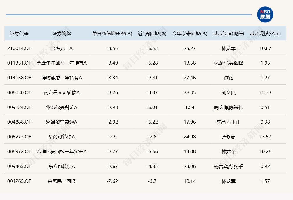 每经记者|肖芮冬 每经编辑|赵云 10月14日,市场全天震荡调整,创业板指、科创50指数盘中双双跌超4%。板块方面,保险、煤炭、银行、港口航运等板块涨幅居前,半导体、CPO等板块跌幅居前。全市场超3500只个股收跌。沪深两市成交额2.58万亿元,较上一个交易日放量2215亿元。 下面一起来看今天公募基金的表现。 (注:榜单1、榜单2仅选取灵活配置型、偏股混合型和普通股票型三类产品作为主动基金的代表,纳入统计;债基相关榜单包括各类主、被动债券型基金) 1.单日涨幅榜 2.单日跌幅榜 3.单日债基涨跌幅榜 4.晚间值得关注的消息 |