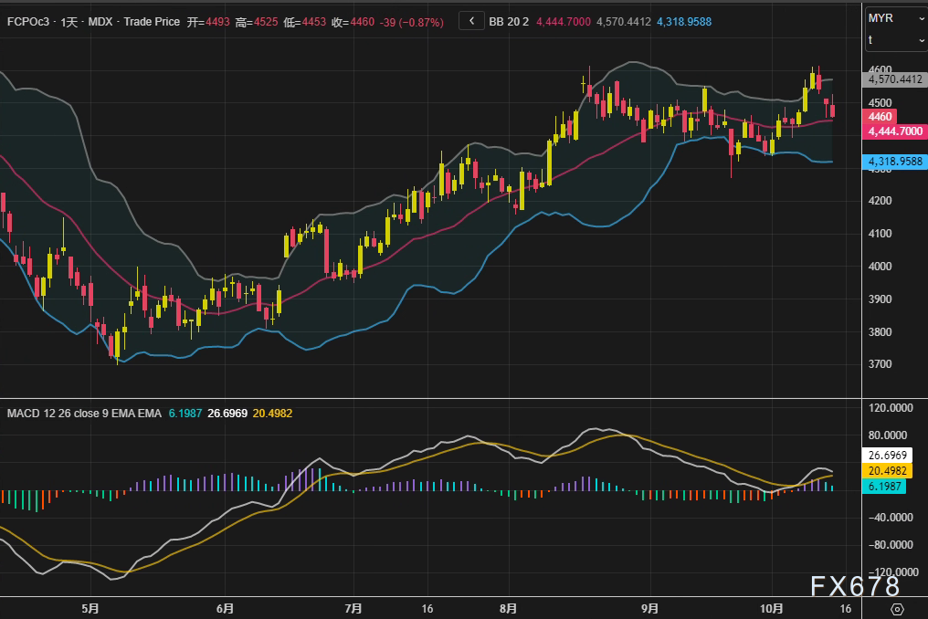 周二(10月15日),马来西亚衍生品交易所棕榈油主力合约延续跌势,截至昨日收盘,12月合约报收4460林吉特/吨,日内下跌39林吉特,跌幅0.87%,已连续三个交易日收跌。盘面技术指标显示,布林带中轨位于4570林吉特附 ...