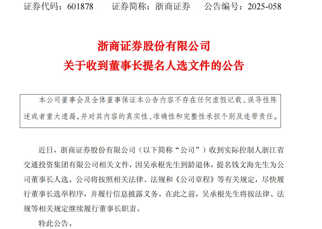 每经记者|王海慜 每经编辑|叶峰 今晚,浙商证券掌舵人将完成新老交棒:吴承根到龄退休,总裁钱文海获提名拟出任董事长。这一变动标志着浙商证券的掌舵人将完成新老交替,也符合业内此前预期。 作为一名“75后”,钱文海自两年前出任浙商证券总裁以来,公司资本运作动作频频,完成了对国都证券股权收购。 未来,摆在钱文海面前的考验是,如何带领公司朝着“中大型券商”的目标冲刺,实现行业进位。 浙商证券新任董事长提名确定 今晚,浙商证券发布公告,公司收到实际控制人浙江省交通投资集团有限公司相关文件,因吴承根到龄退休,提名钱文海为公司董事长人选。 截图自:浙商证券公告 根据公开信息,今年吴承根年满60岁,到了退休的年龄。吴承根掌舵浙商证券已经有近20年,据了解,在公司内部,对他多年来的工作成绩评价颇高。 2006年起,吴承根深度参与并主导了浙商证券的重组与振兴之路。彼时,公司前身金信证券因持续亏损陷入资不抵债困境,行业排名位列60名之后,员工不足300人,网点集中于浙西南地区。 在浙江省政府的统筹部署下,浙江交通集团旗下沪杭甬公司通过债转股方式控股重组,于2006年8月正式成立浙商证券。吴承根临危受命,出任公司董事、总裁,并于后续升任董事长。在他的带领下,浙商证券实现了从资本规模到行业地位的全面提升,并于2017年实现IPO。 力争在2030年跻身“中大型券商”行列 此次提名为公司新任董事长人选的钱文海,目前担任浙商证券党委书记、总裁。2023年6月,他从实控人浙江交通集团旗下财务公司调任至浙商证券主持经营工作。事实上,自2024年7月由钱文海接任公司党委书记后,业内对他将接棒的预期就较高。 钱文海在公司任职两年多来,已在推动战略并购、资本运作等方面有较多动作,而未来摆在他面前的考验,是如何带领公司实现冲刺“中大型券商”的目标。 根据浙商证券战略规划,到2030年末,力争营收、利润总额、总资产、净资产等核心指标全面翻倍,综合实力进入行业前15位。 据Choice数据,截至去年末,浙商证券营收、利润总额、总资产、净资产等核心指标在行业内的排名分别为第12位、第19位、第21位、第22位。在利润总额、净资产两项指标上,行业第15名分别比公司高出27%、56%。 这就意味着,要实现综合实力排名提升的目标,在未来5年内,公司的发展不仅要跟上行业整体的前进步伐,还要走得比其他同行更快。这其中,通过并购重组来壮大自身是国内外证券公司实现规模进阶的必由之路。 回顾近两年来,浙商证券资本运作动作频频,继2023年3月参与民生证券股权竞拍后,后又于当年末启动并购并实质控股国都证券。目前钱文海兼任国都证券董事长,统筹两家机构的战略协同与整合发展。如今,公司已构建起“长三角+京津冀”双核驱动的全国化发展格局。 据了解,根据既定规划,未来,浙商证券将继续推进对国都证券的整合,释放协同效能。公司计划重点推进客户资源共享、业务渠道打通、研究能力整合,力争实现“1+1>2”的融合效应。 封面图片来源:每日经济新闻 |